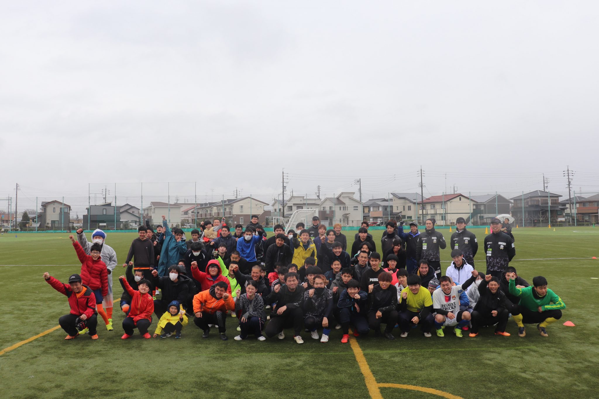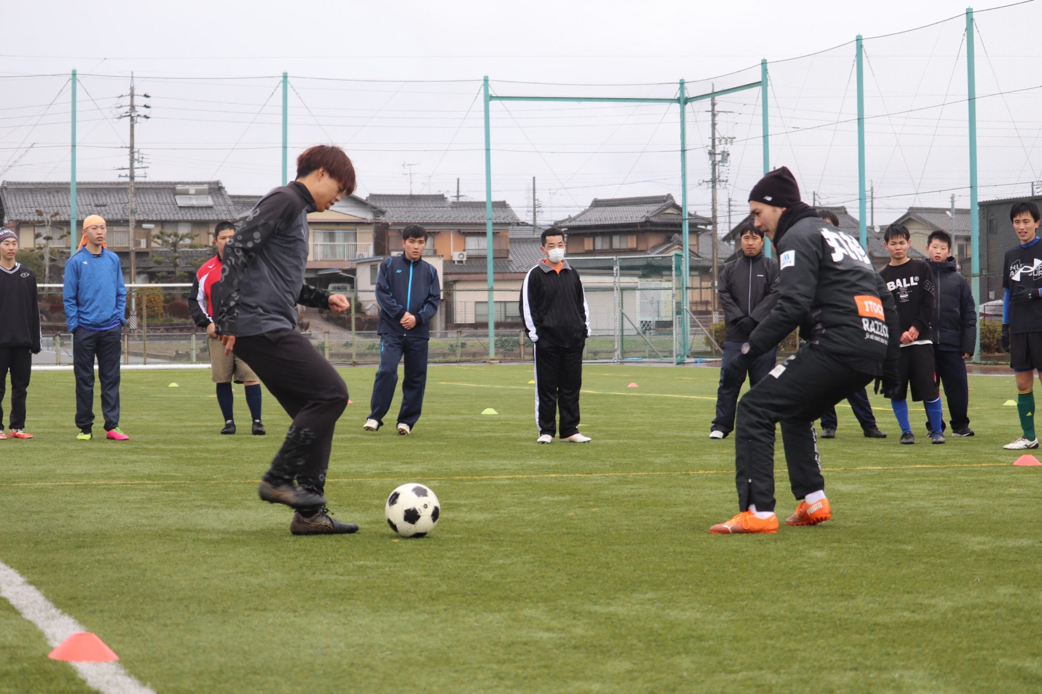 小雨降る寒い中での実施となりましたが、両グループ2時間のサッカー教室を行いました。