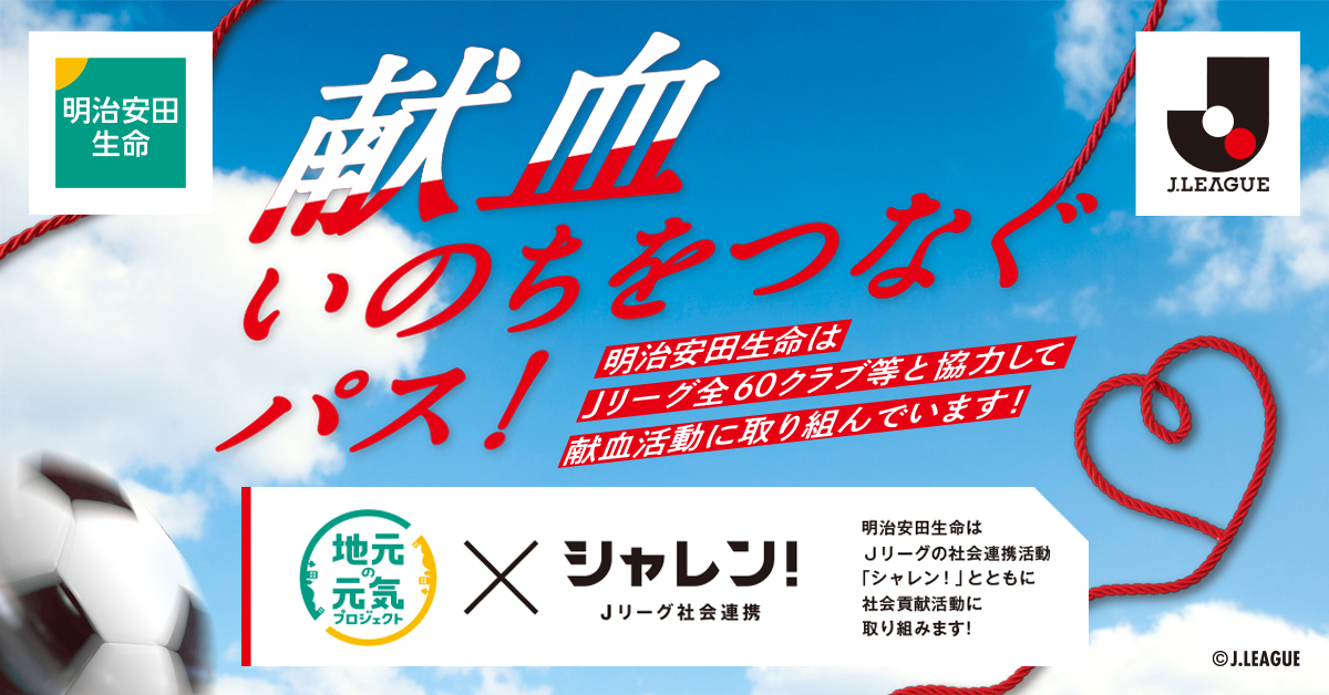 明治安田生命×岐阜県赤十字血液センター×FC岐阜 の3社連携にて「シャレン!で献血」を実施します。スタジアム・献血ルームにて献血にご協力いただいた方の中から抽選で選手サイングッズ等をプレゼントいたします。