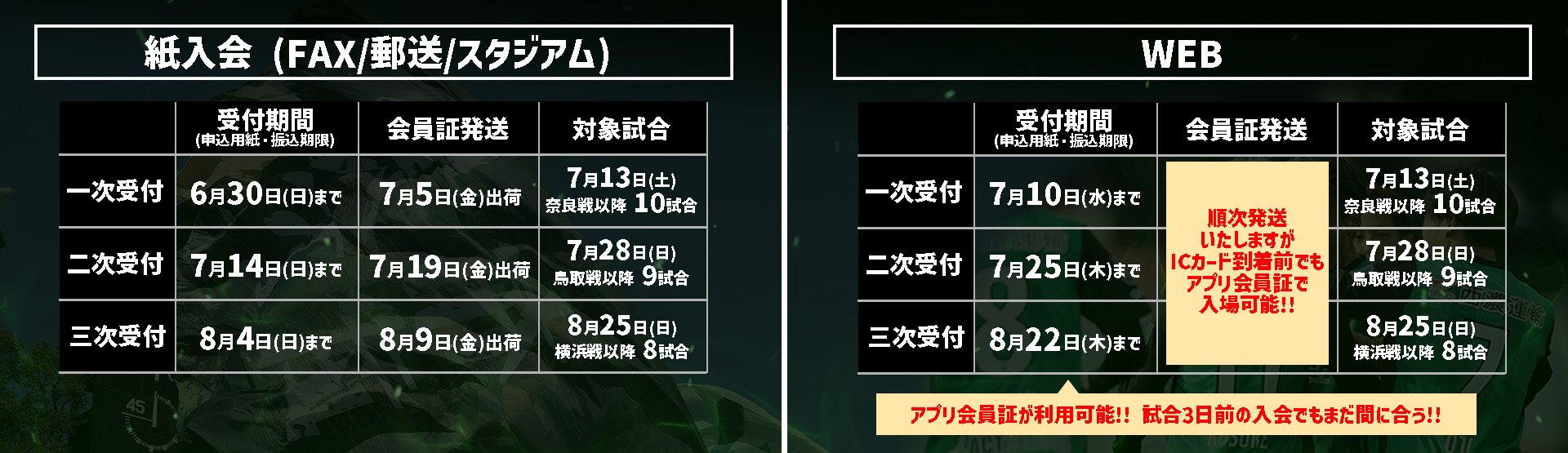 「WEB受付」または「郵送、FAX受付」または「ホームゲームスタジアム受付」