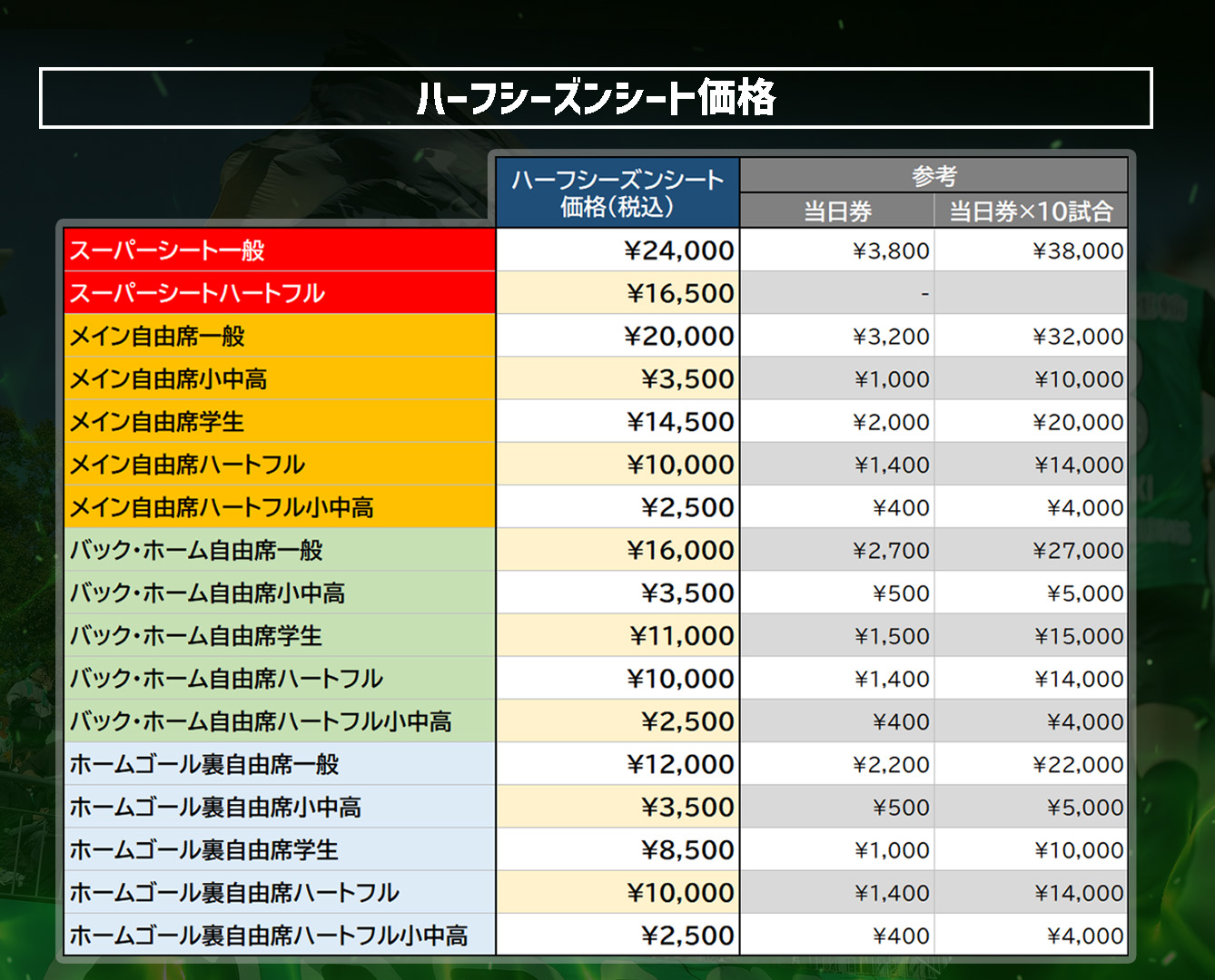 ※ハーフシーズンシートは継続価格はございません。どなた様も「新規」でお申し込みいただきます。