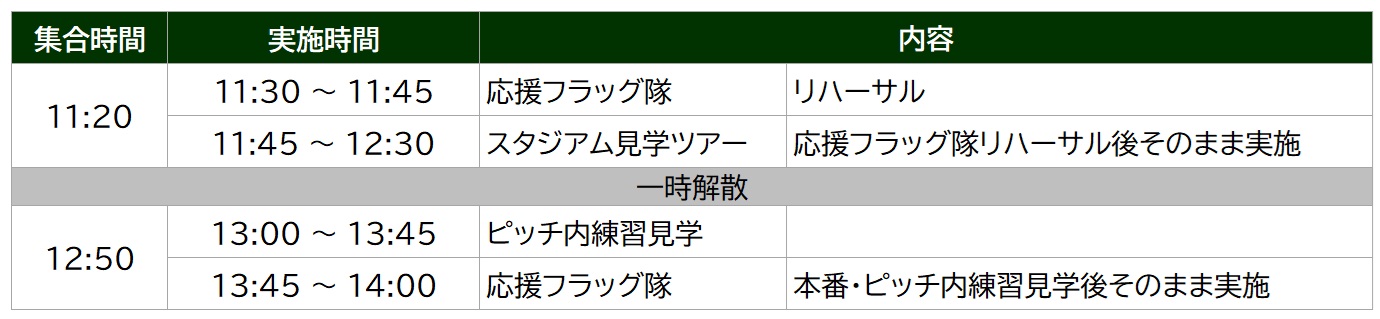 普段は見ることのできないスタジアムの裏側や、試合に臨む選手たちのピッチ内ウォーミングアップ見学をお楽しみいただけるほか、試合に挑む選手の入場を「応援フラッグ隊」で熱く盛り上げよう!!
