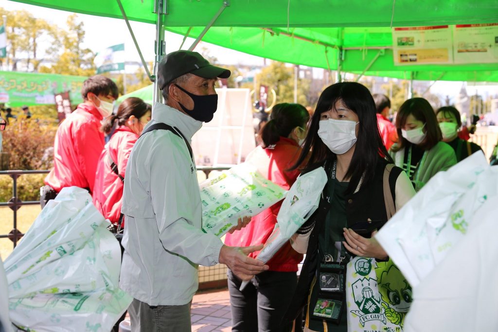 FC岐阜ボランティア「グリーンズ」は「岐阜県民が常に快適にスポーツに関わることができるようにサポートし、スポーツ文化の醸成のための活動の在り方を求め続ける」を活動理念とし、「全緑(ぜんりょく)サポート」を心掛けて試合運営を支える活動を行っています。