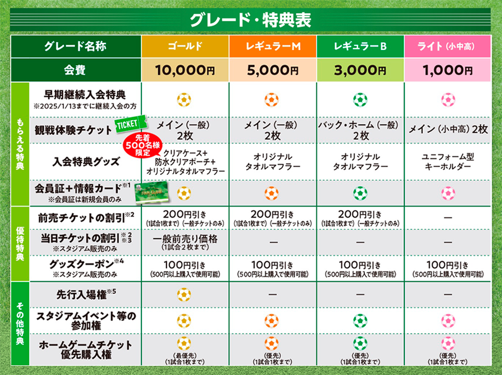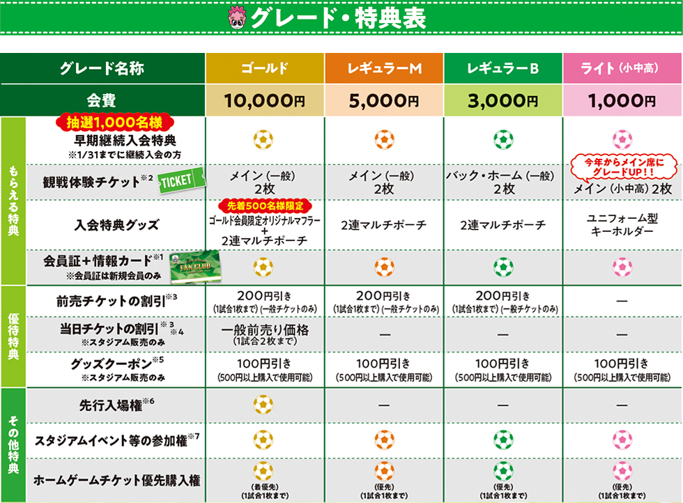 - ファンクラブ特典は、ファンクラブ会員証がお手元に届き次第ご利用いただけます。ただし、WEB入会の方は『ホームゲームチケット優 先購入権』および『前売りチケット割引(ライト会員は除く)』は、会員証到着前でもご利用いただけます。