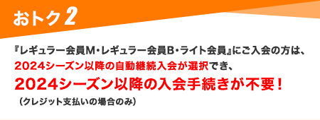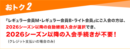 - ご入会の際にお渡ししました会員証は、2026シーズン以降も引き続きご使用いただくものとなります。なくさないように大切に保管をお願いします。