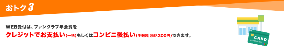 - ファンクラブ年会費のお支払いは、クレジットカード(一括)もしくはコンビニ後払い(手数料 税込300円)となります。
