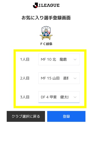 FC岐阜を選択し、お気に入り選手・監督を登録。
