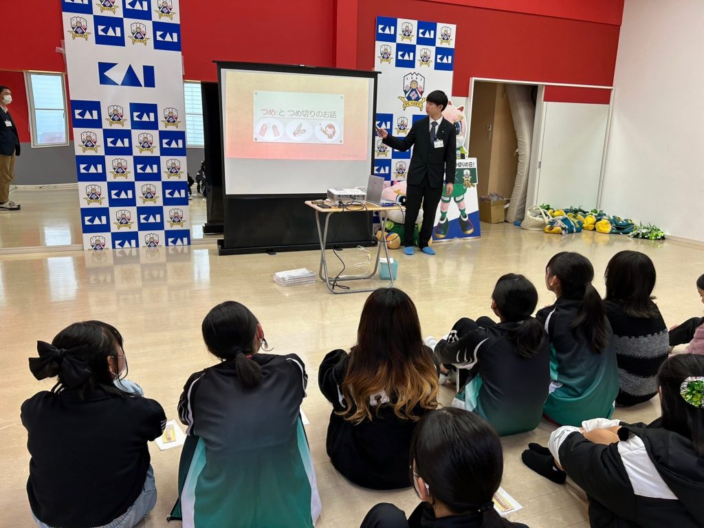 さて、そんなグリーンエンジェルズですが、FC岐阜のグリーンパートナーでもある「貝印株式会社」様にお越しいただき、“つめとつめ切り”の授業を受けさせていただきました。