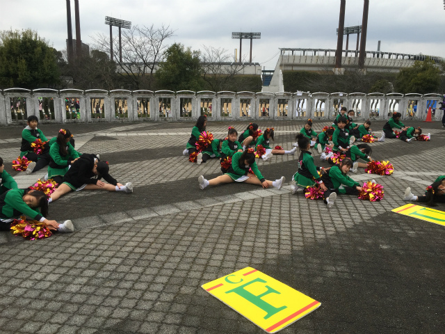 お出迎えの後は、試合前出演に向けて練習です。まずはストレッチから。