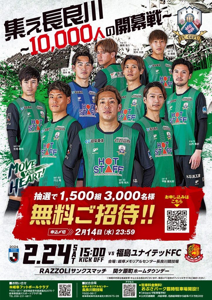 ぜひお誘いあわせの上、長良川競技場にご来場いただき、ご家族や職場の皆様とご一緒に、熱いご声援をよろしくお願い致します。