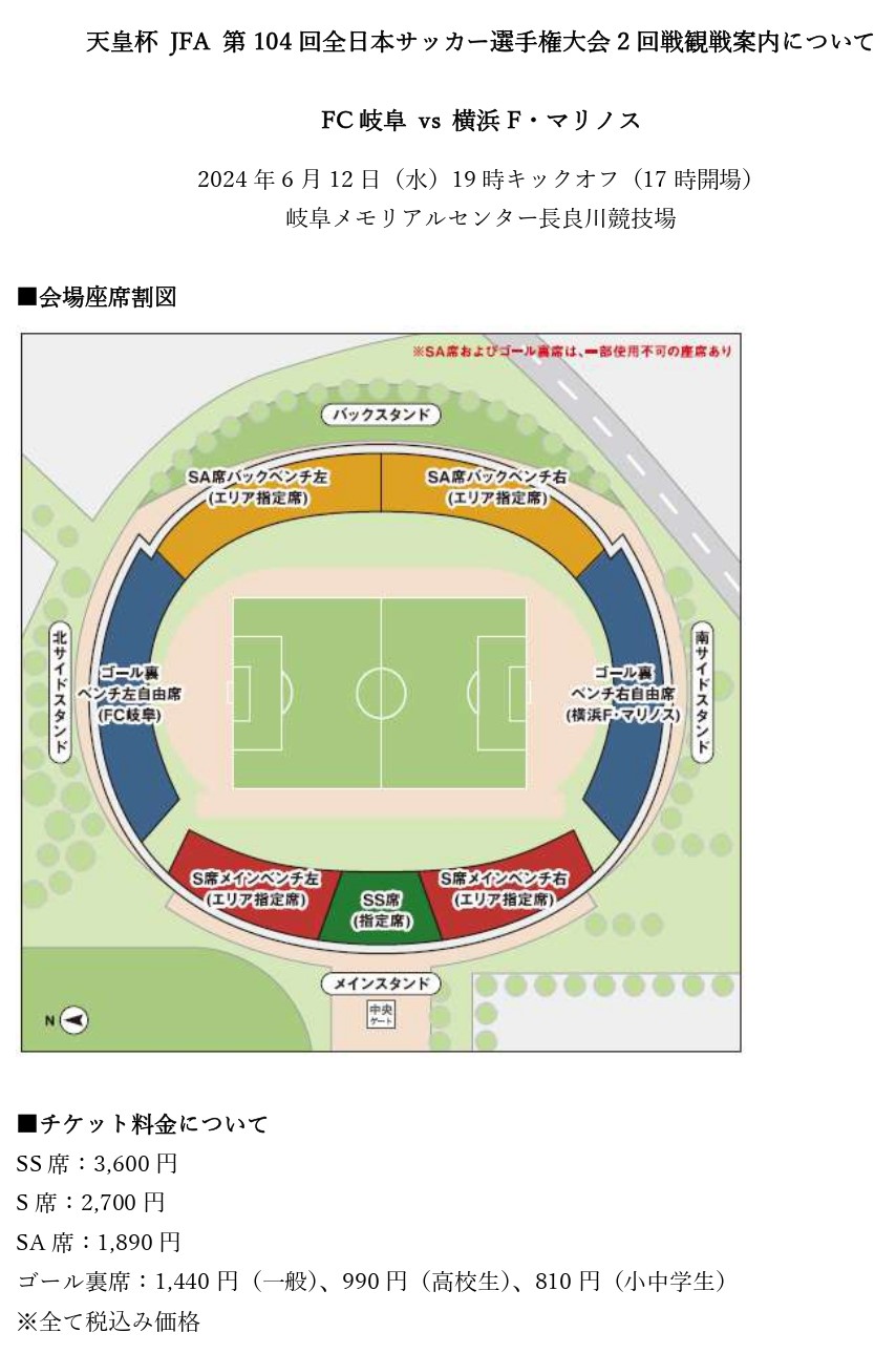 6月12日に長良川競技場で行われます、天皇杯2回戦のチケットにつきまして、ご案内いたします。