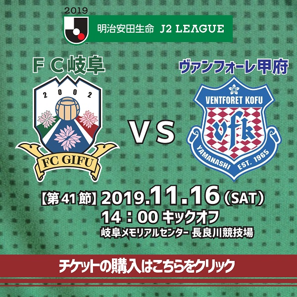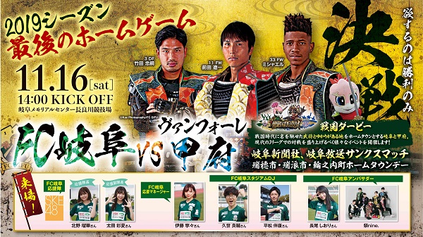 対戦相手のヴァンフォーレ甲府は現在7位につけ、プレーオフ争いを繰り広げている強敵です。FC岐阜もJ2残留に向け、勝点3が絶対条件の試合となります!2019シーズンのホーム最終戦となる甲府戦、皆様の応援で勝利を目指して戦う選手の後押しをよろしくお願いいたします!