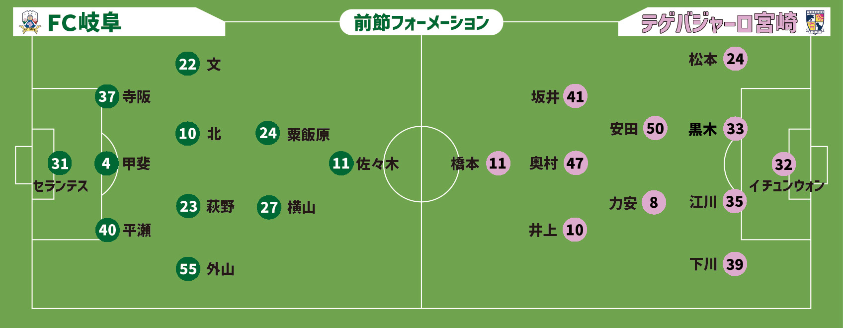 手強い相手ではあるが、岐阜が過剰に畏れる必要はない。6月11日の天皇杯2回戦ではフォーメーションを3-4-2-1に変更し、前半の45分間に関してはJ1の湘南ベルマーレをほぼ完全に封じ込めることに成功。この3バックを継続したJ3第16節AC長野パルセイロ戦では2-1の勝利を収めた。この手応えを忘れず立ち向かっていけば、宮崎とも十分闘える。