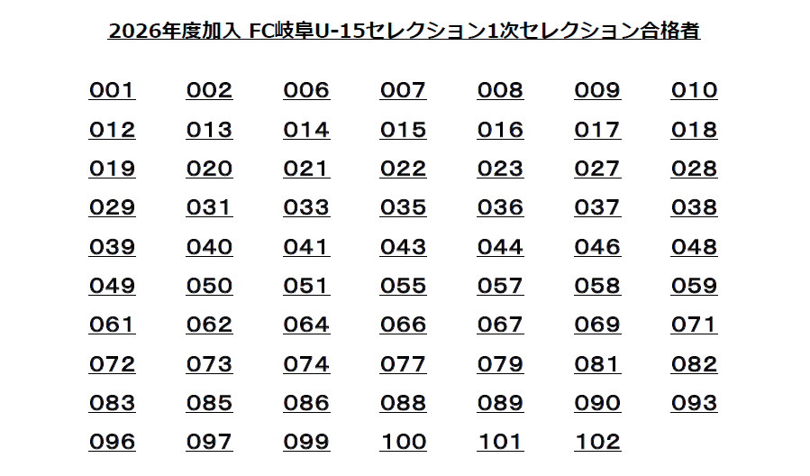 2026年度 FC岐阜U-15選手セレクション 1次セレクション 合格者番号