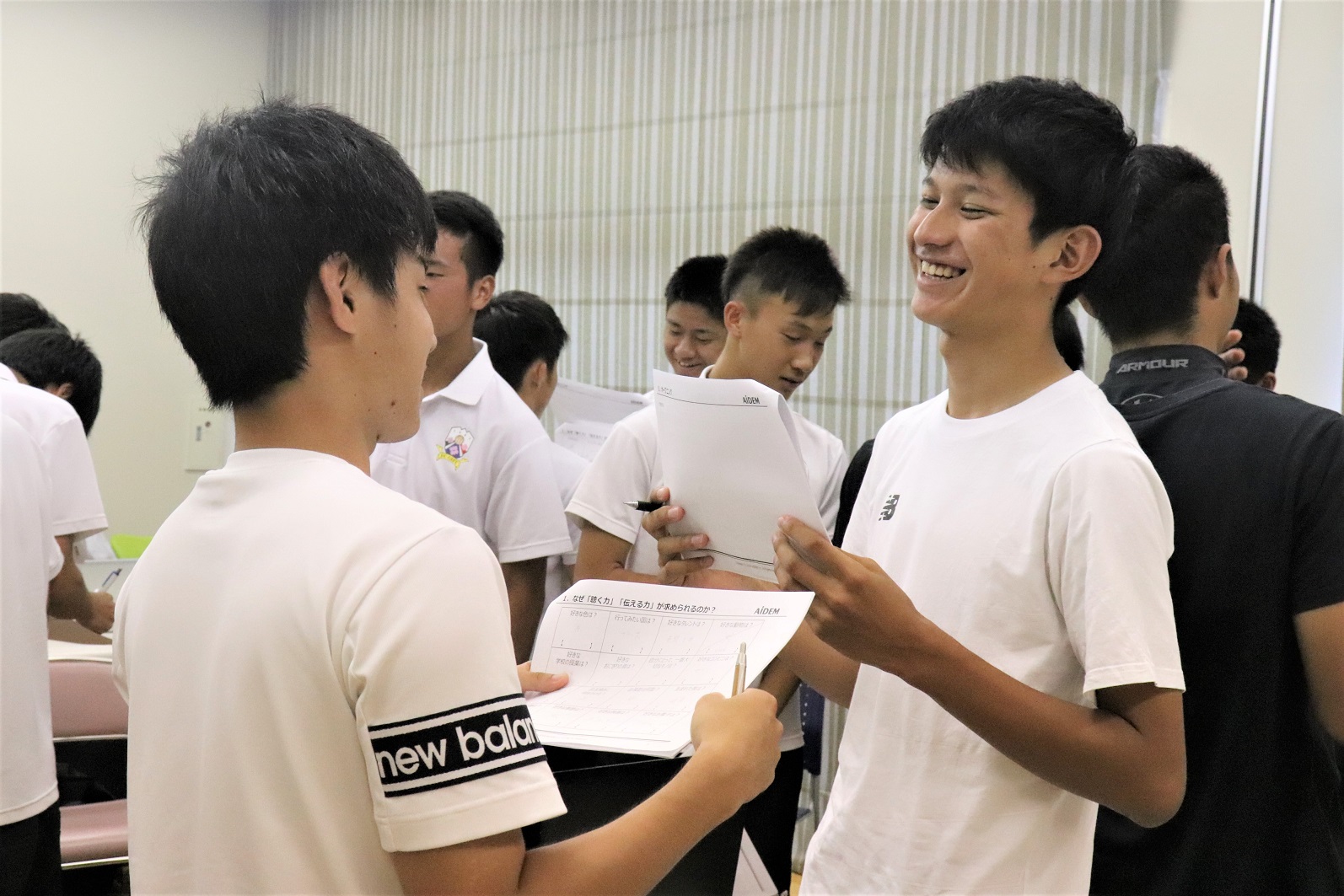 まずは相手との共通点探しのワークからスタート。自分と相手の意外な共通点や知らなかったお互いの好きな物などが分かると、選手たちからも自然と笑顔や驚きの声があがりました。