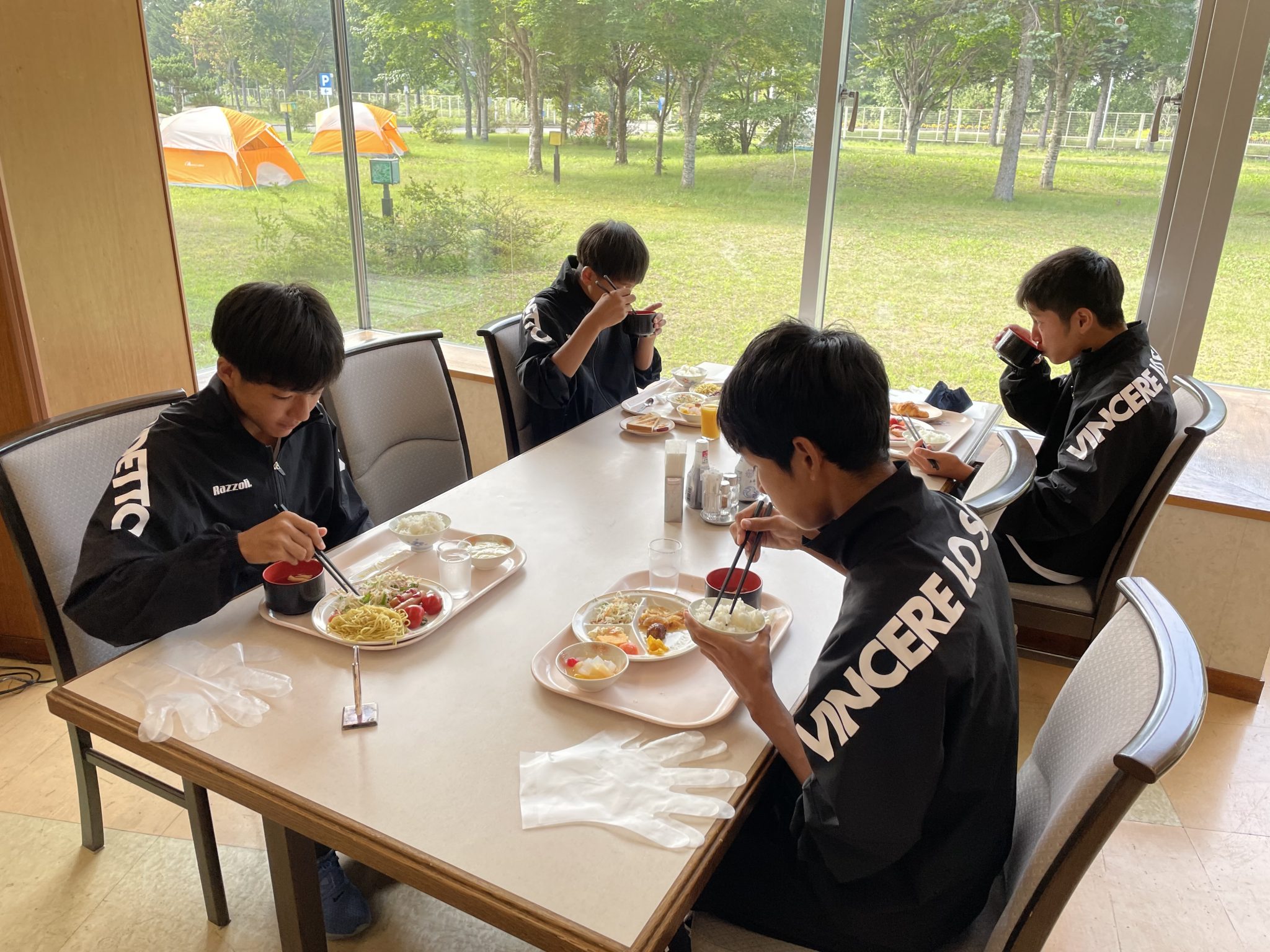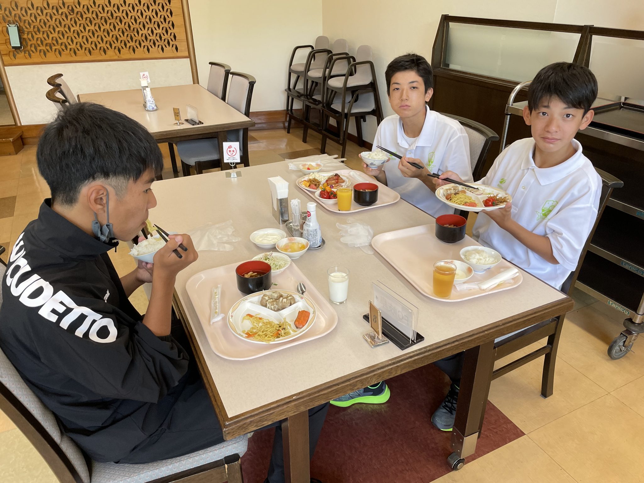 ストレッチの後は朝食の時間。朝からしっかりと食べて試合に備えます。