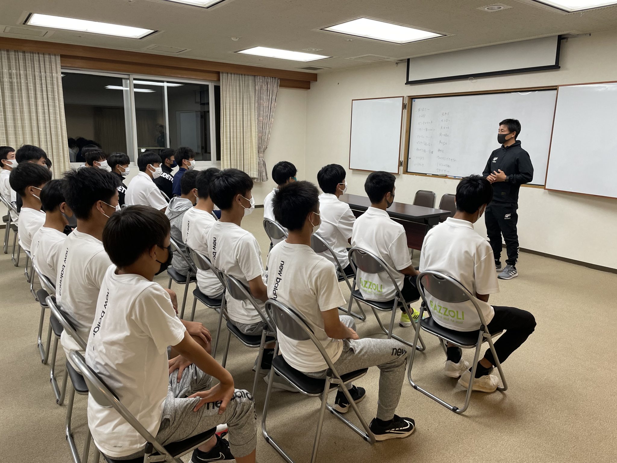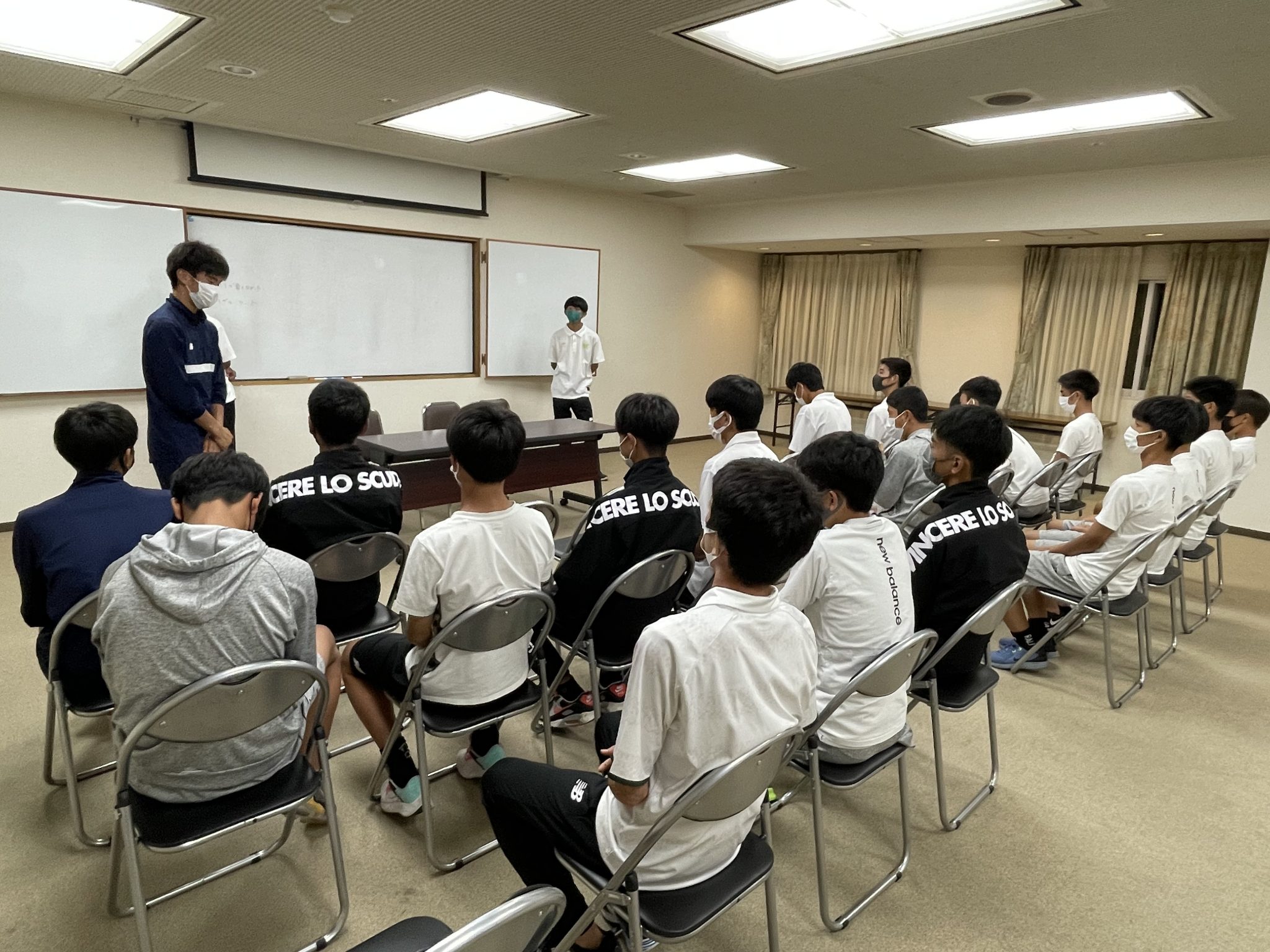 夕食の後はミーティングを行い、選手同士で今日の試合の良かった点や課題を共有しました。