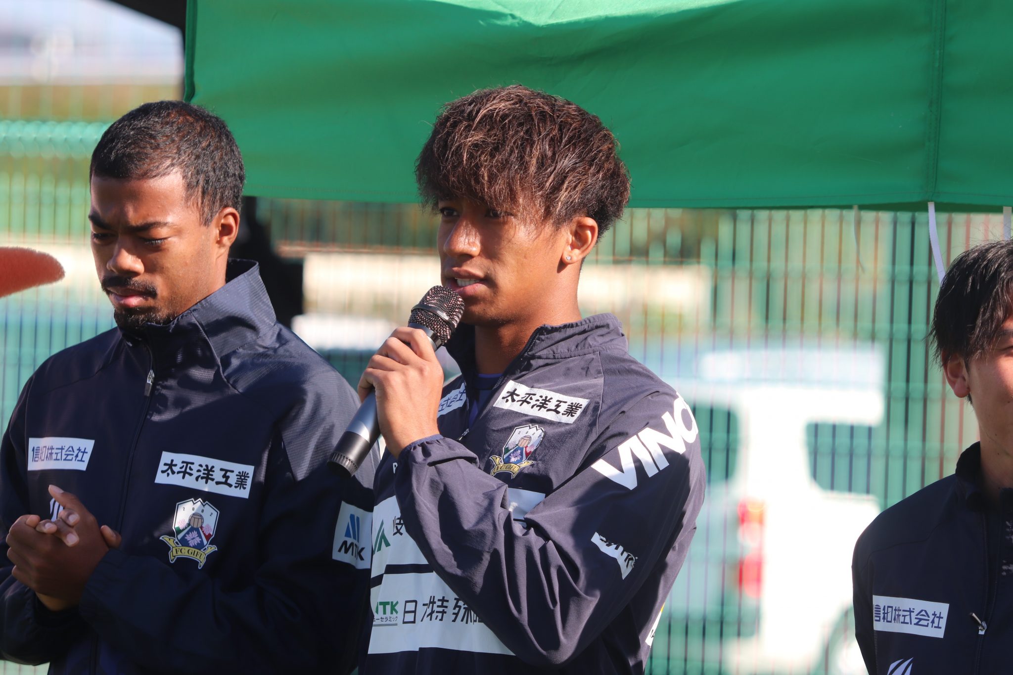 その後、藤谷匠選手、ンドカチャールス選手、松本歩夢選手、三國スティビアエブス選手、山内彰選手、村田透馬選手の6名とギッフィーが登場し、チーム分けを行いました。