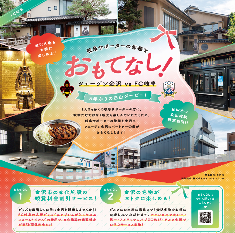 4月28日(日)は、FC岐阜屋台村から金沢ゴーゴーカレースタジアム(金沢市磯部町口75-1)への出張飲食出店や金沢市内の観光地や金沢名物をお得に楽しめる企画が準備されています。