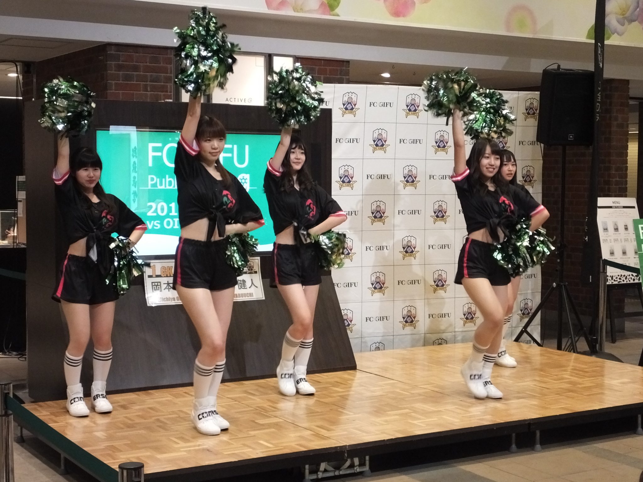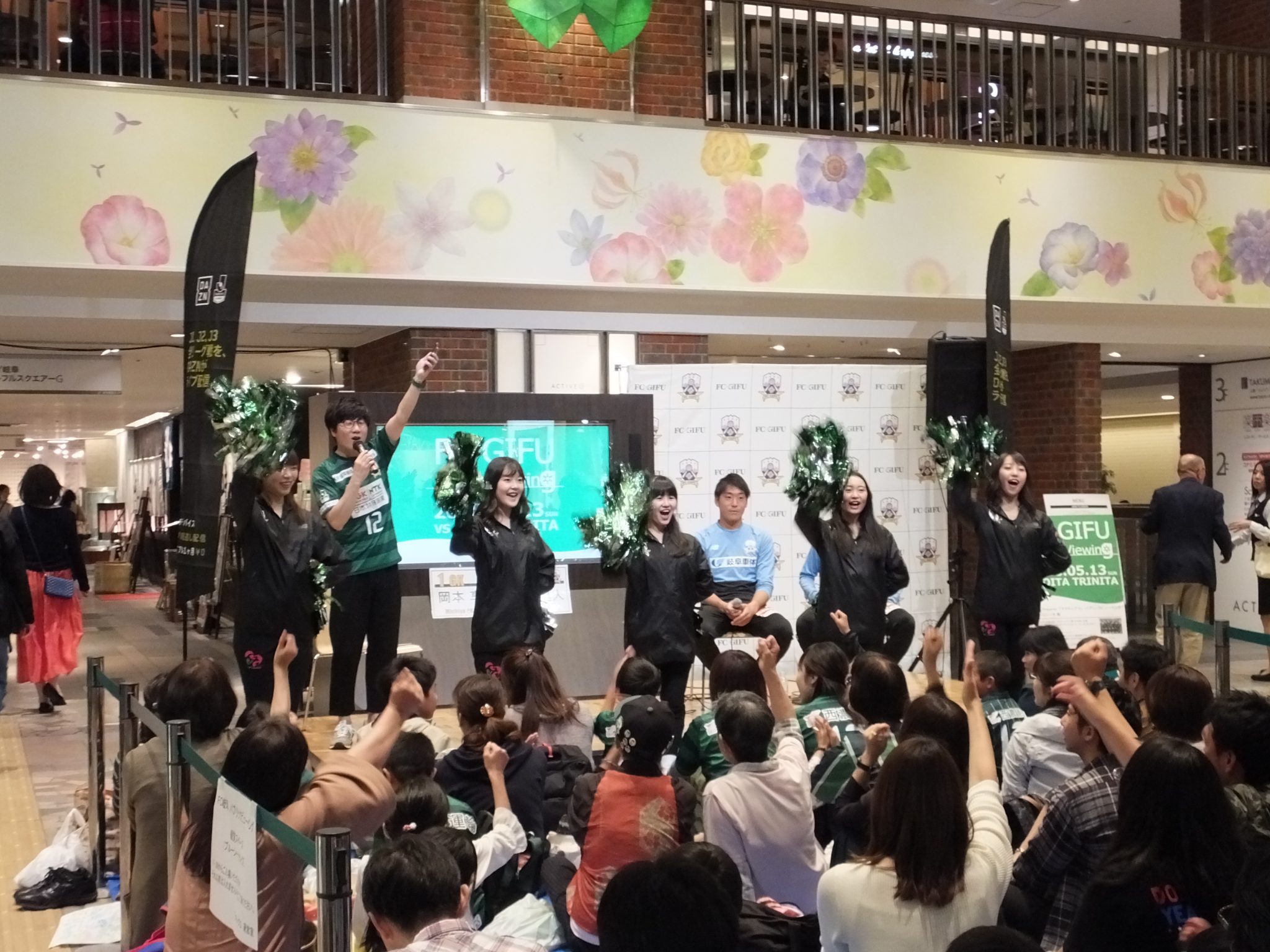 パブリックビューイングのオープニングは、先日5月6日に長良川競技場で行われた松本山雅戦にてお披露目させていただいたFC岐阜チアダンスチームGGG(トリプルジー)のパフォーマンスです。スタジアム外のイベントはこの日が初めてとなりました。オープニングを華やかに盛り上げました。