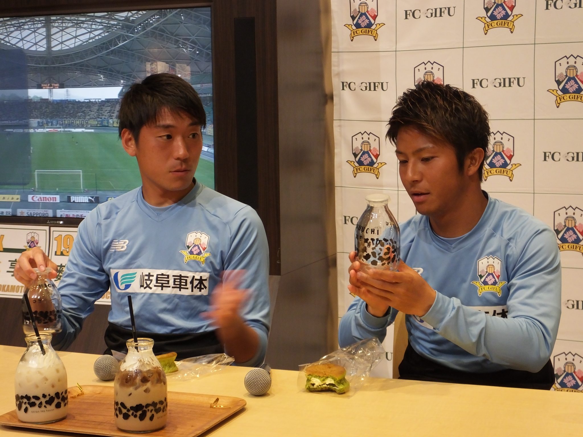 紹介をしたのは、FC岐阜のグッズも取り扱っていただいているファン・サポーターおなじみの「敷島珈琲店(アクティブG・2F)」の新商品「FC岐阜パン」。そして、アクティブGに6月20日までの期間限定でご出店されている「MILK BOTTLE STAND」の「コーヒーミルク」と「黒蜜ほうじ茶ミルクティー」です。