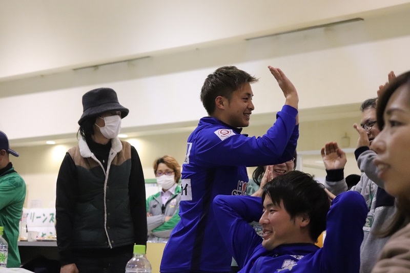 その後、村田透馬選手、会津雄生選手、柳澤亘選手、長倉颯選手の4名とギッフィーが登場し、チーム分けを行いました。