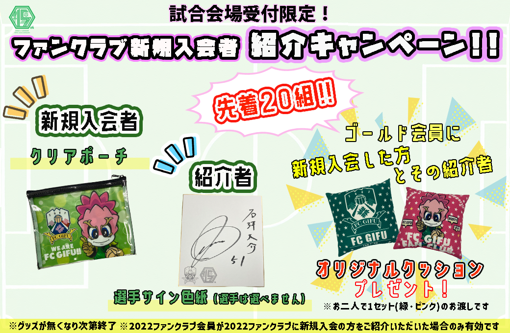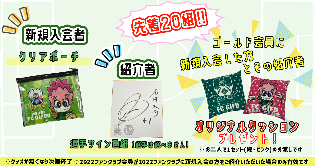 ・ご入会後に2022シーズン新規入会でない、もしくはご紹介者が2022ファンクラブ会員でないと確認が取れた場合は、ご連絡させていただきます。その場合は無効となりますので、予めご了承ください。。