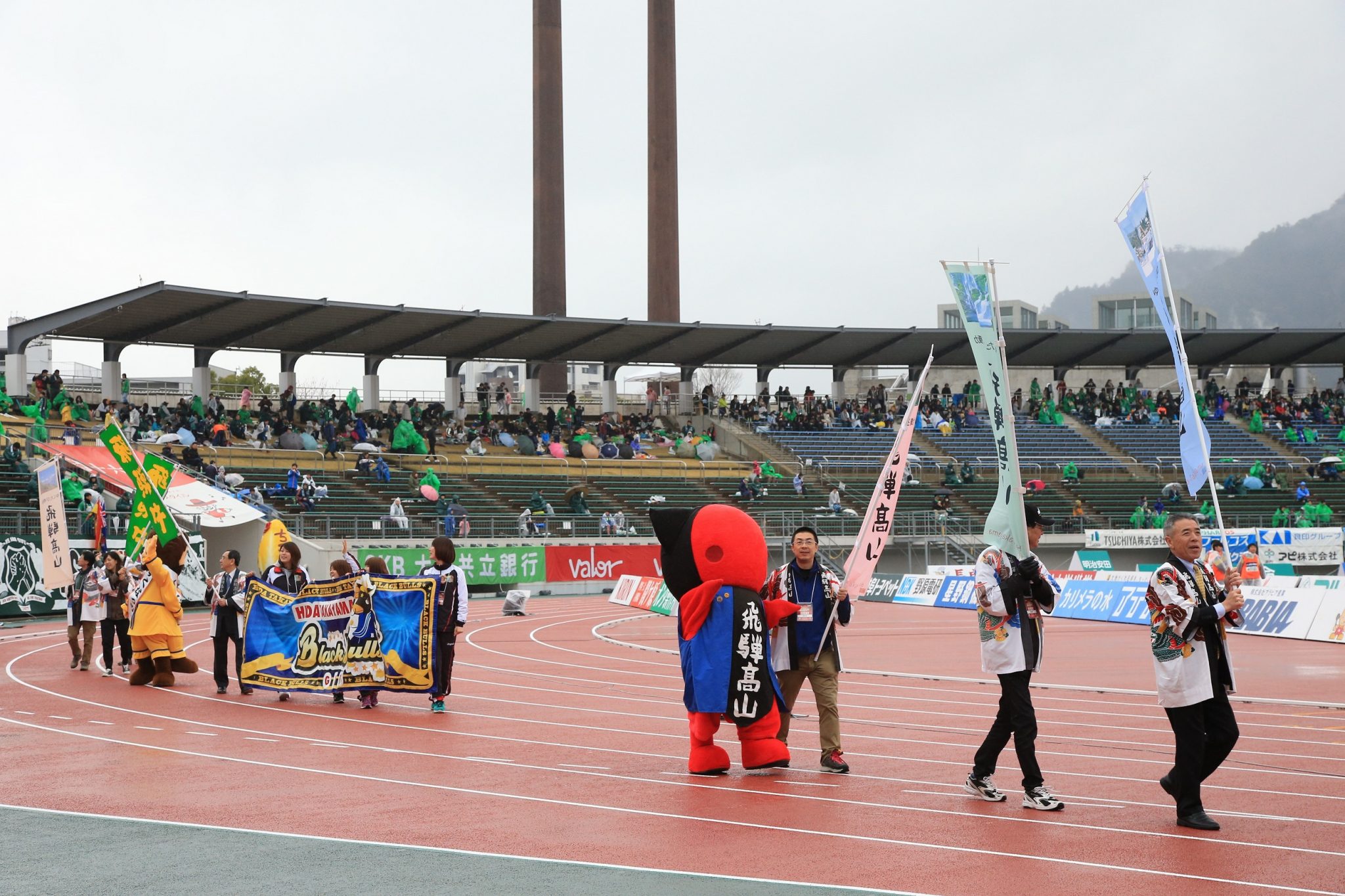高山市ご当地キャラクターの『さるぼぼのひだくん』や『すくなっツー』、トップリーグの「日本ハンドボールリーグ」に参戦している『飛騨高山ブラックブルズ岐阜』の選手をはじめとする皆さんがスタジアム内を回り、高山市のPRをおこないました。