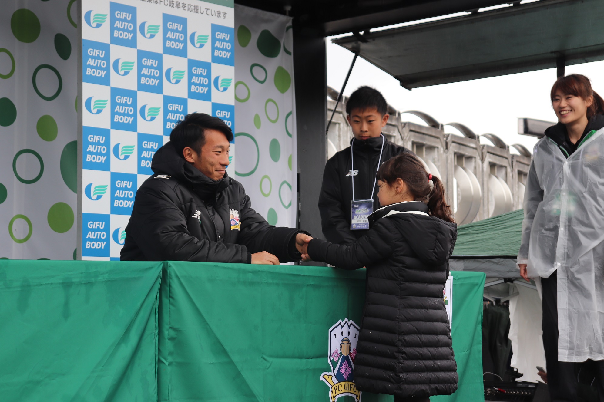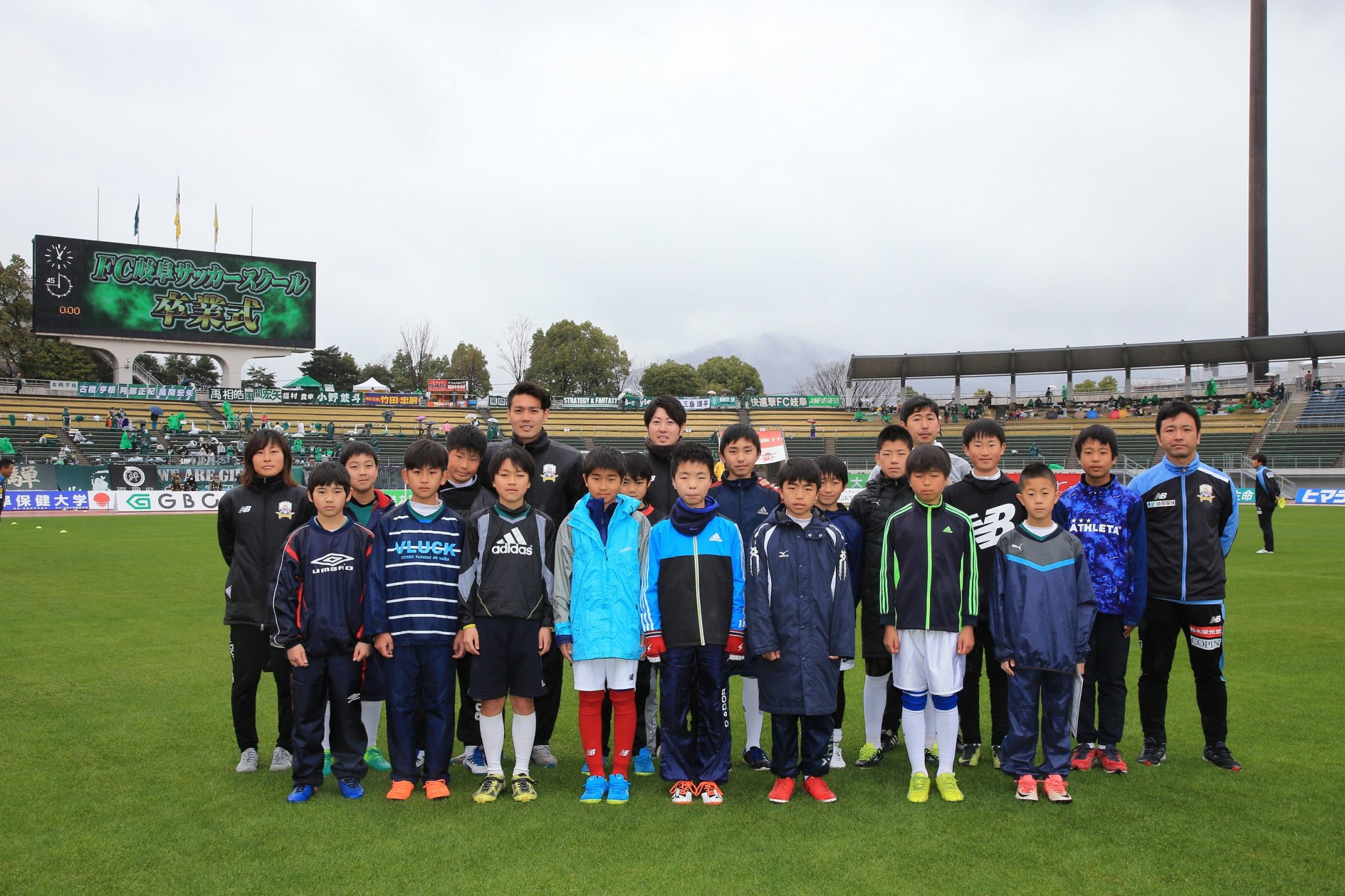 FC岐阜サッカースクールの卒業式がピッチで行われました。雨のため、卒業記念試合が中止となりましたが、憧れのピッチでの卒業式とあって、スクール生たちの嬉しそうな顔が印象的でした。
