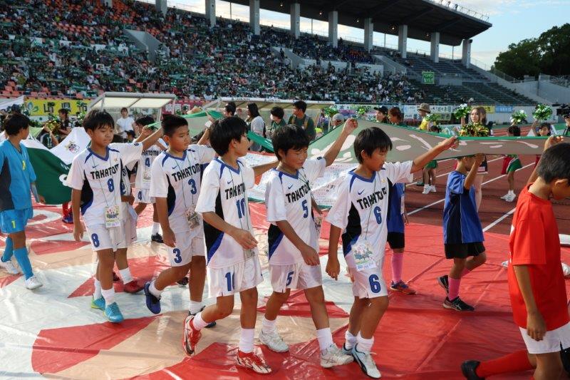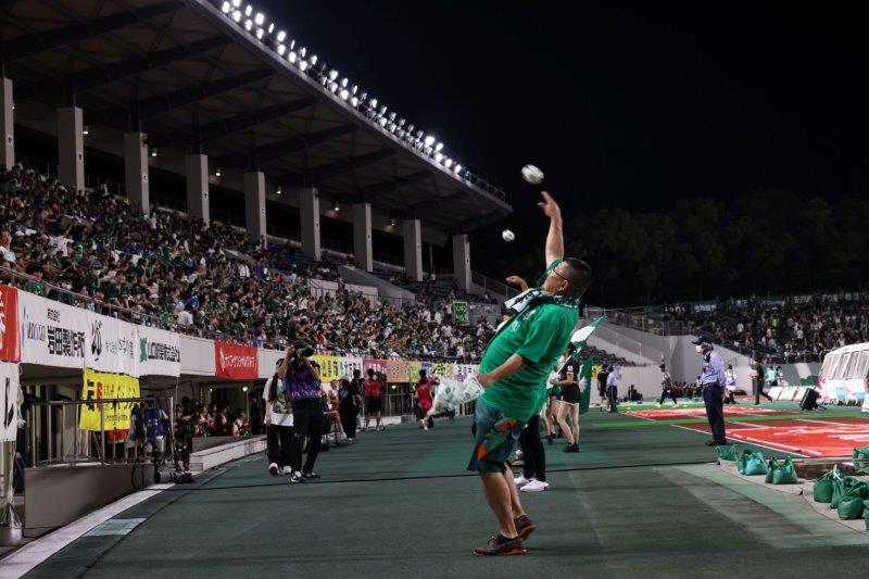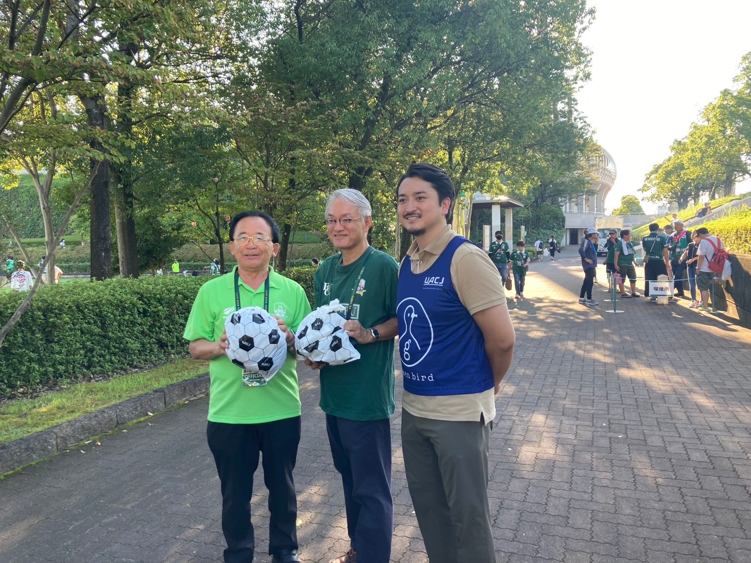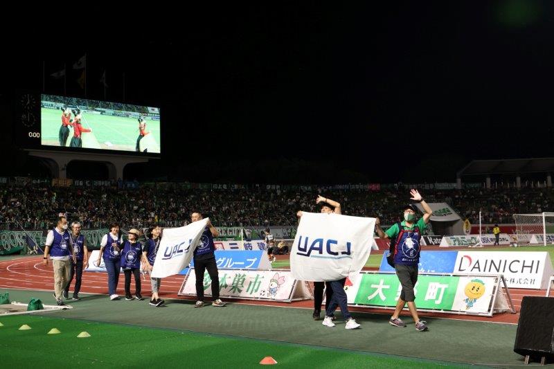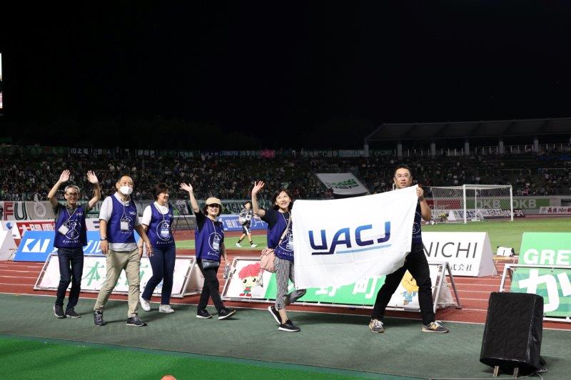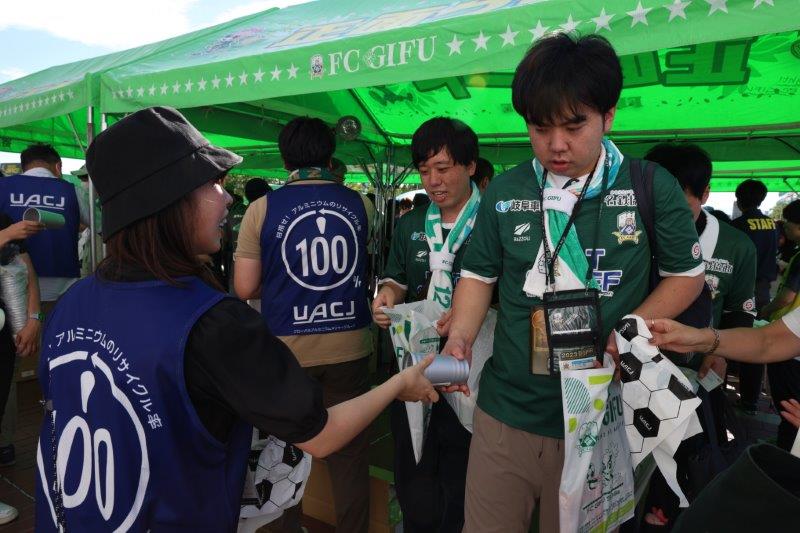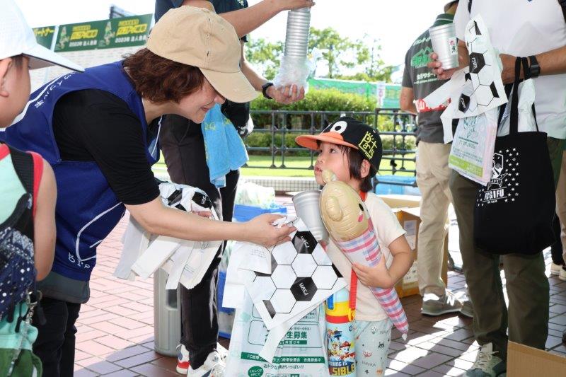 世界トップクラスのアルミニウム総合メーカーである株式会社UACJ 様から、来場者プレゼントとして、コラボアルミカップ600個とごみを入れて結ぶとサッカーボールになるごみ袋5,000枚をご提供いただきました。試合終了後には芝生のミニコートでごみ袋でゴールを決めて、ごみを残さない試合作りをしました。
