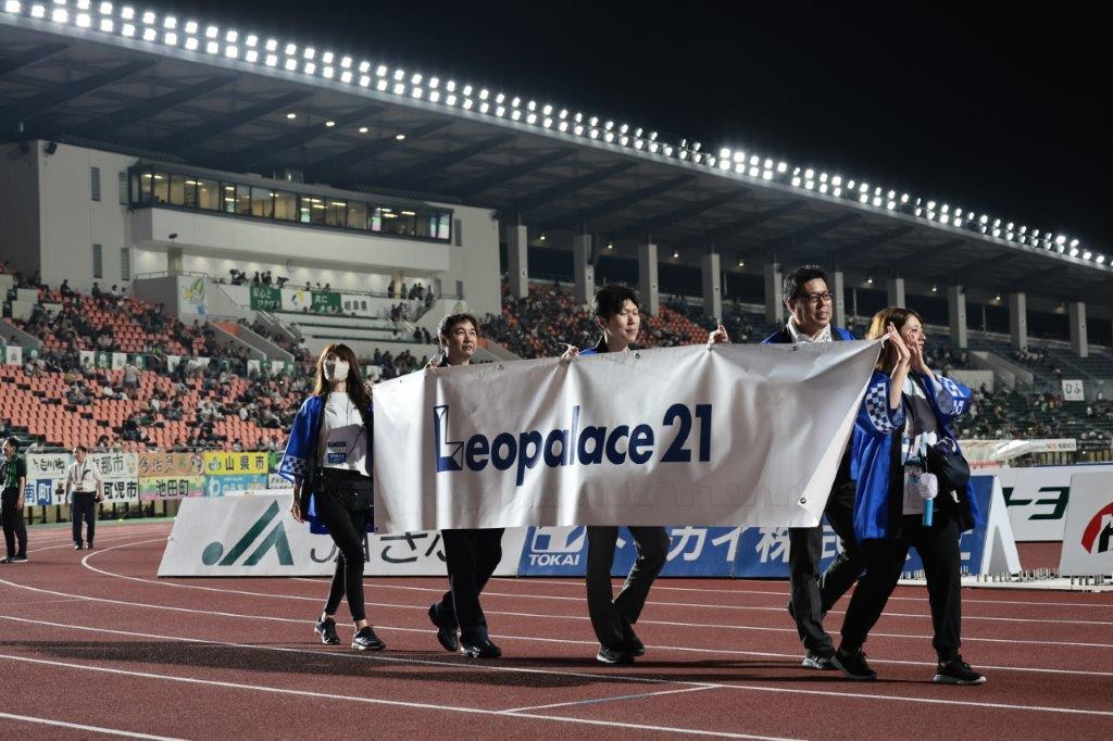 ◇ センターサークル応援団 代表取締役社長 宮尾文也様、執行役員 松永英剛様、開発営業部チーフエキスパート 水野靖様、レオパリスくん