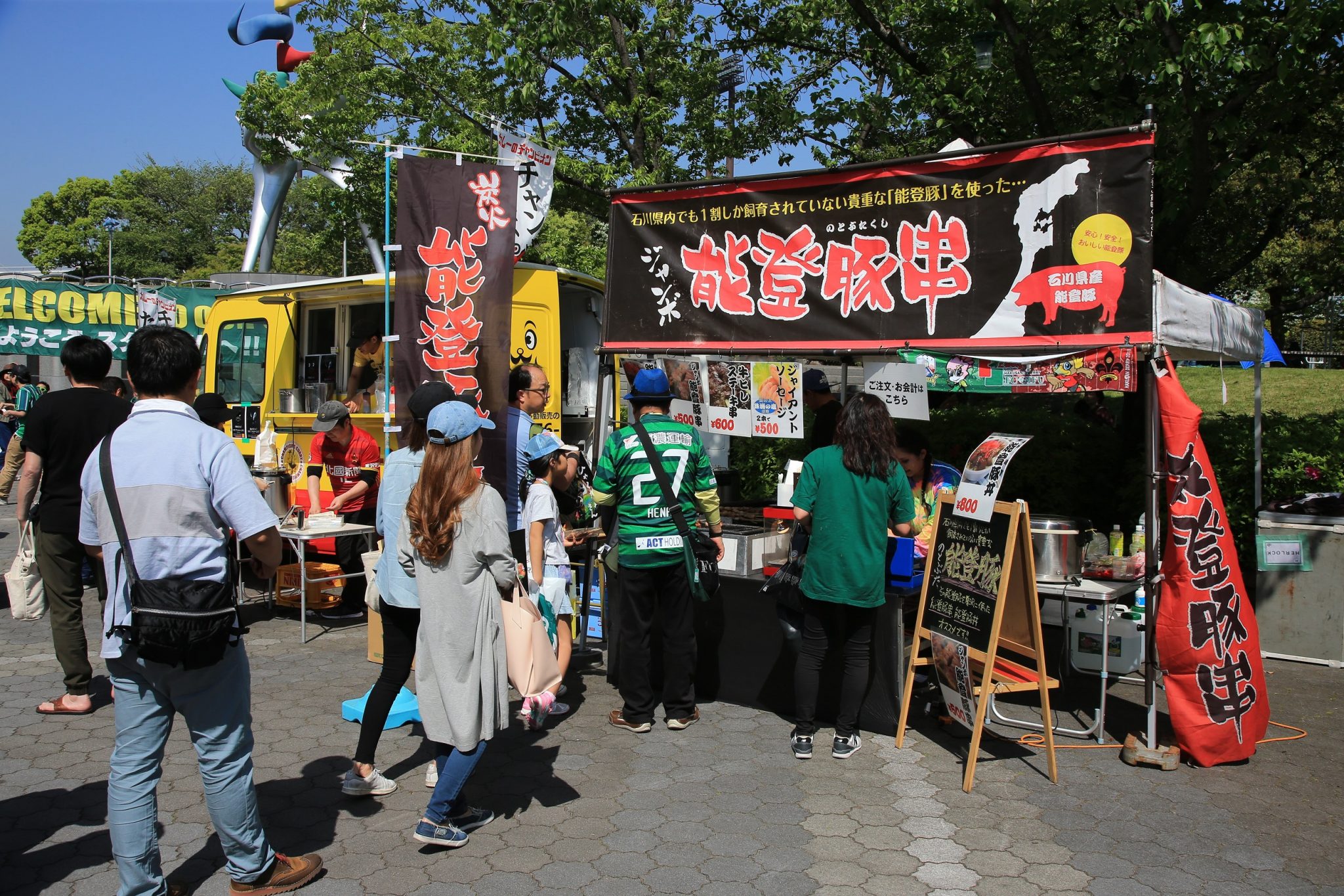 ツエーゲン金沢のオススメグルメ「チャンピオンカレーのLカツカレー」と「HERLOCKのジャンボ能登豚串」が出張で出店!多くの人が金沢の味を求めて賑わっていました!