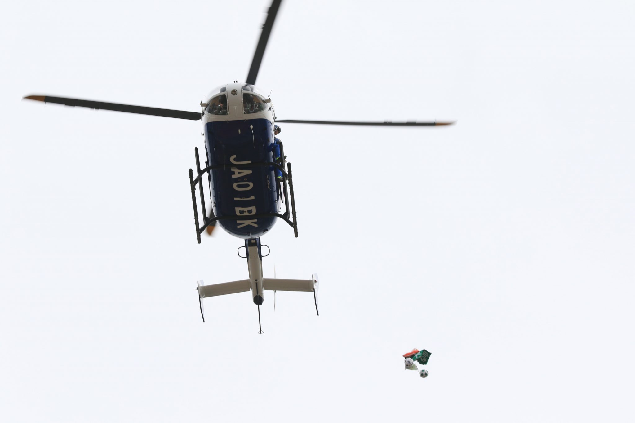 川崎重工業ヘリによる上空からの始球式!落下先はまさかの場所でしたが、会場も大盛り上がり!ギッフィーはキャッチできなくて残念そうでした。