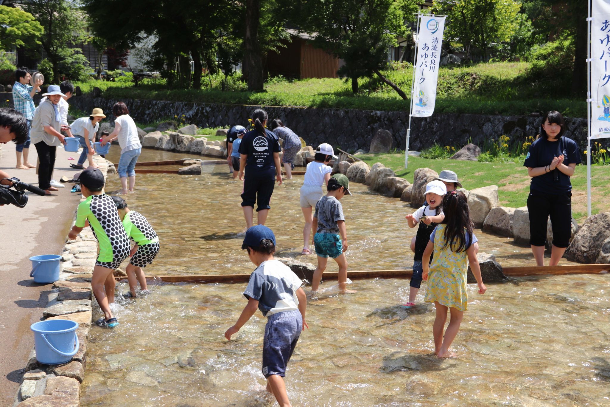 鮎を手づかみで取ることができ、捕まえたお魚は、炭焼きで焼いて食べれます。(先着150名)