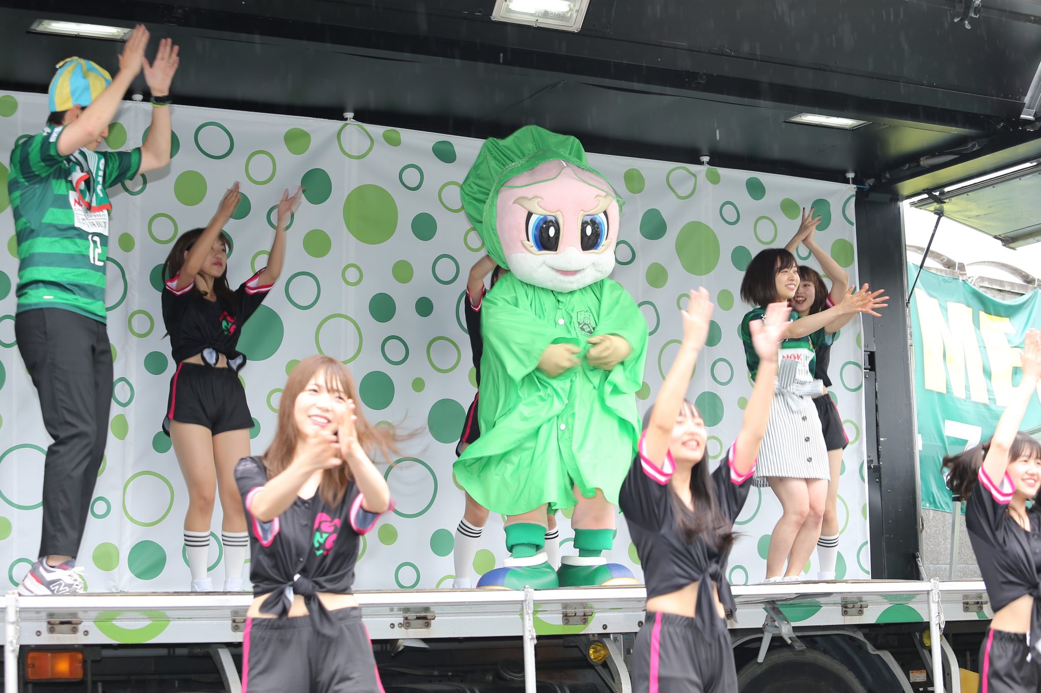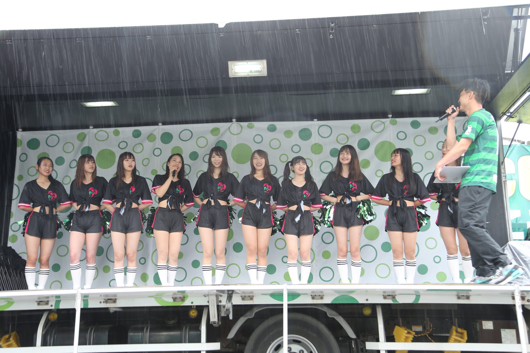 FC岐阜大人のダンスチアチーム「GGG(トリプルジー)」もステージでパフォーマンス。雨が強く降る中でしたが多くの観客で賑わいました。