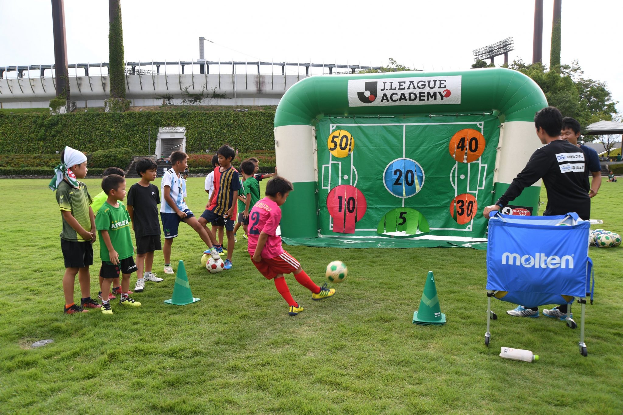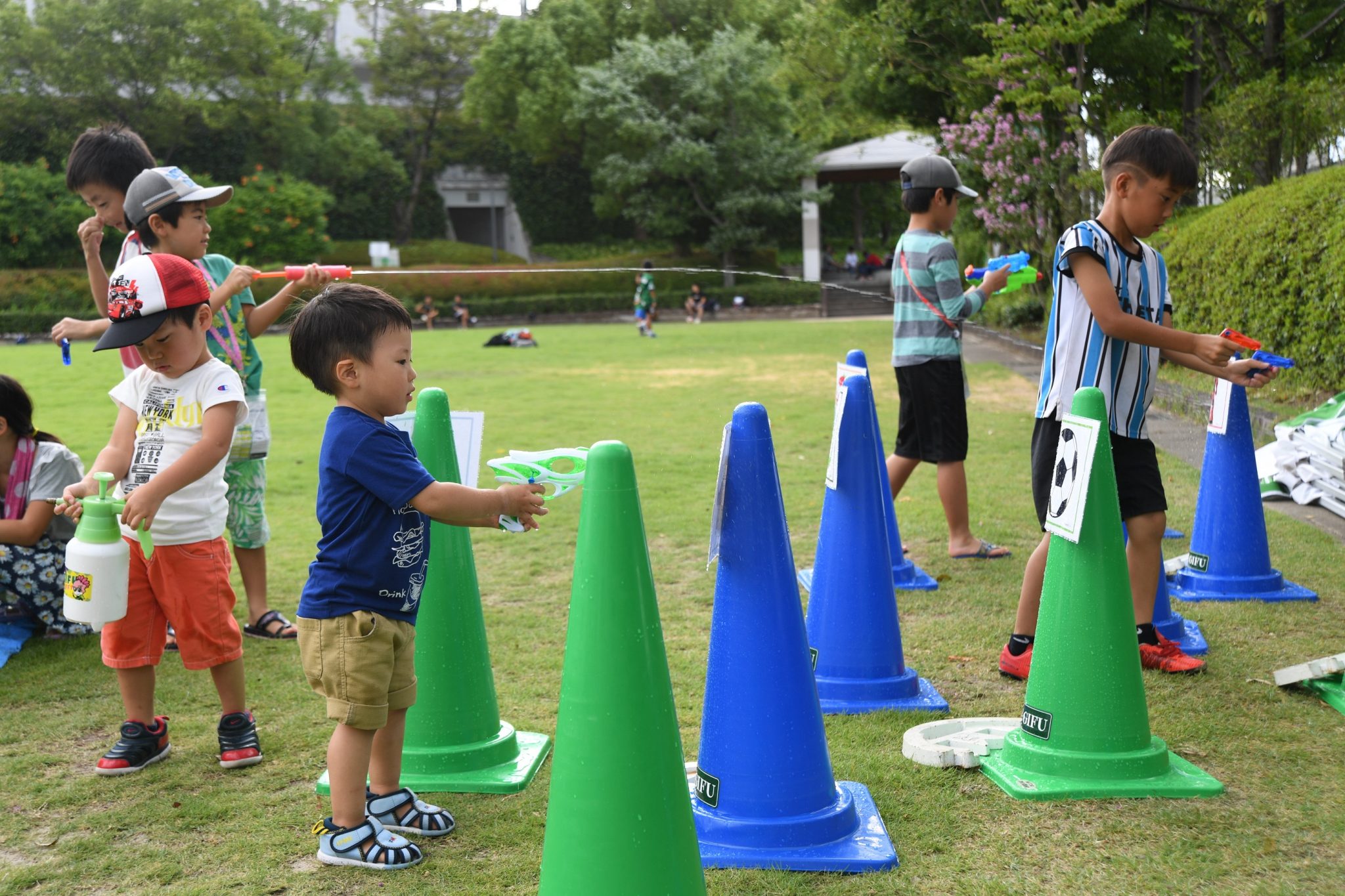 「キックターゲット」と「水遊びコーナー(水鉄砲遊び)」が登場!この日も暑かったので、水鉄砲で楽しく遊ぶ姿が印象的でした。