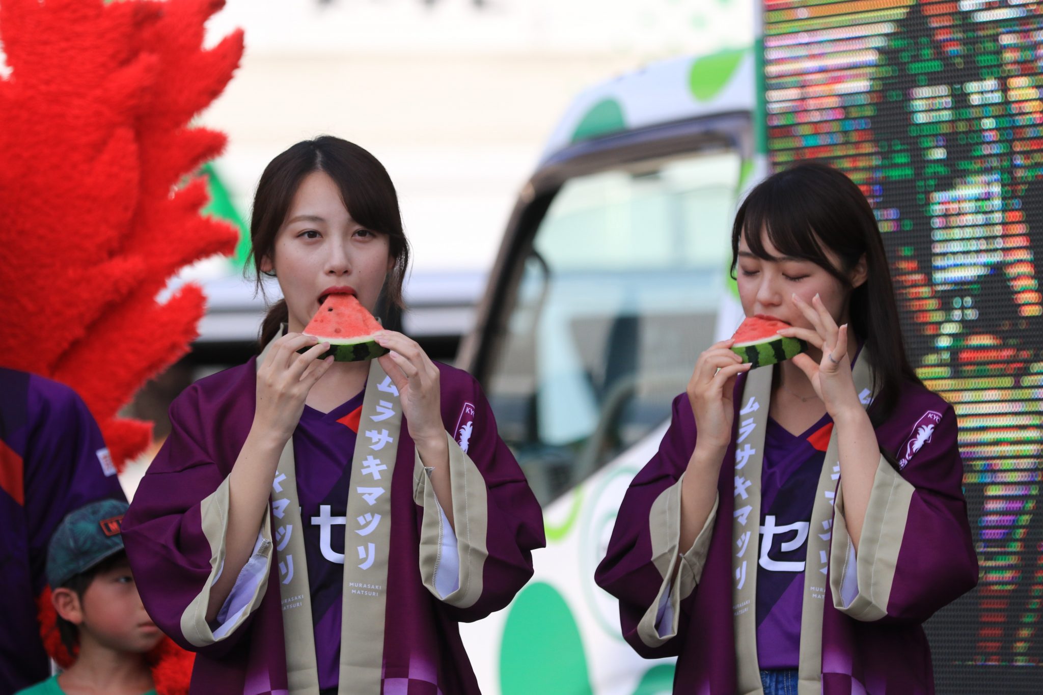サンガキャンパス隊の青木美奈実さんと、梅村遥奈さんも来場!写真撮影会やスイカわり対決、スイカの種とばし対決など、イベントにも色々と参加していただきました!