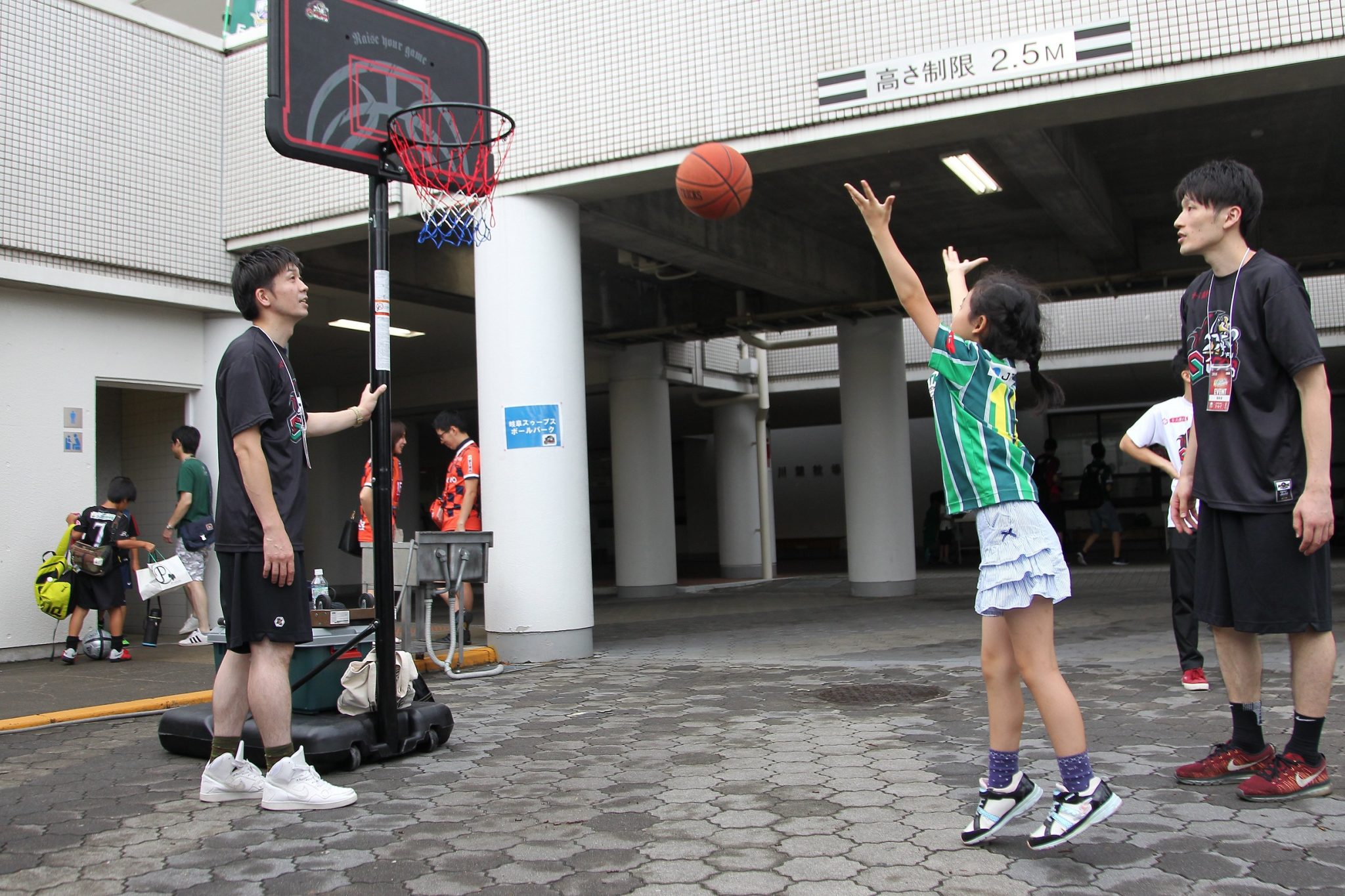 会場にバスケットゴールが登場。岐阜スゥープスの選手に教えて貰いながらシュート!列ができるほど人気でした!