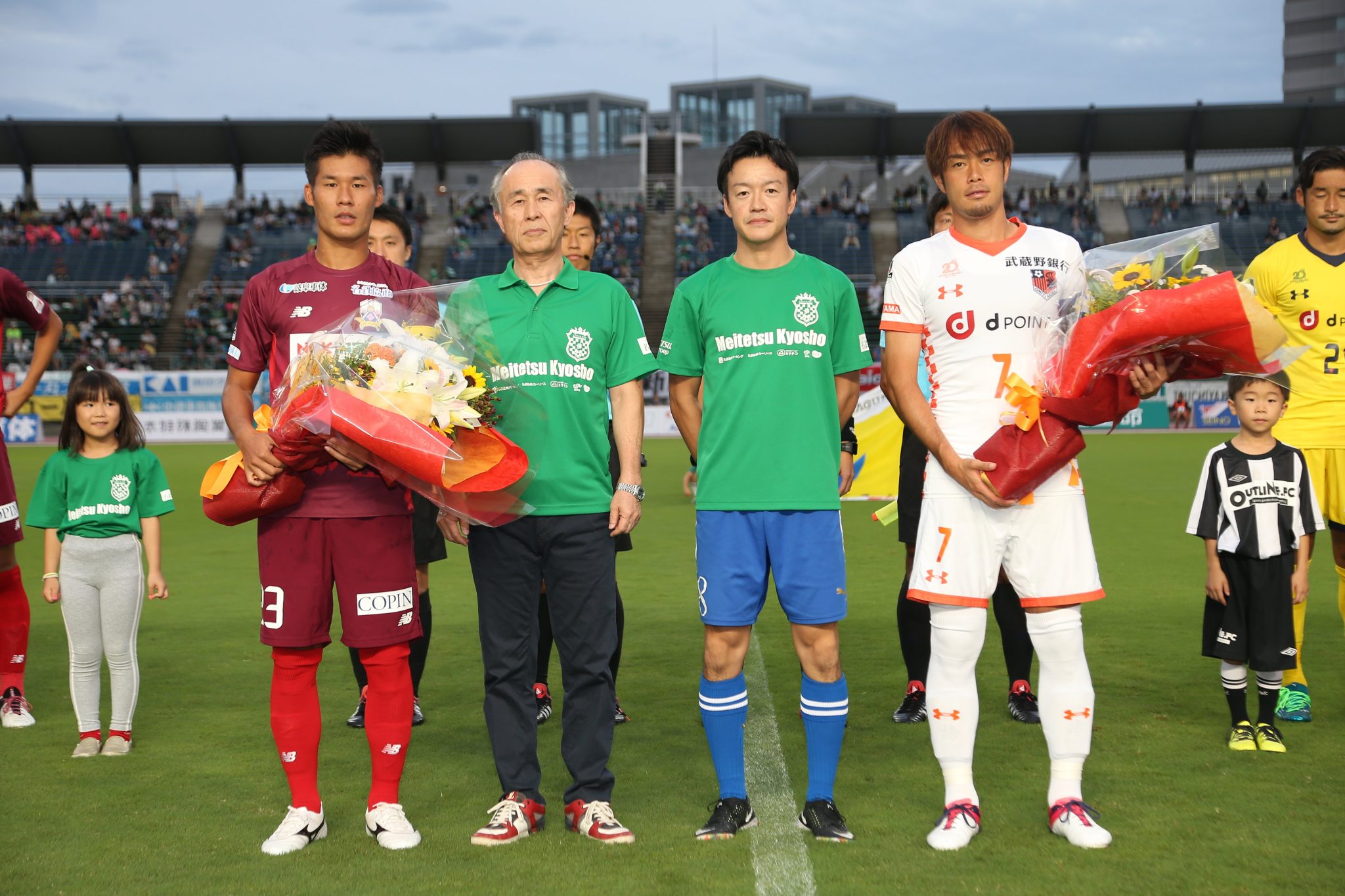 名鉄協商 代表取締役社長 髙橋 健治 様・サッカー部キャプテン 鈴木 淳 様より記念品の贈呈をいただきました。