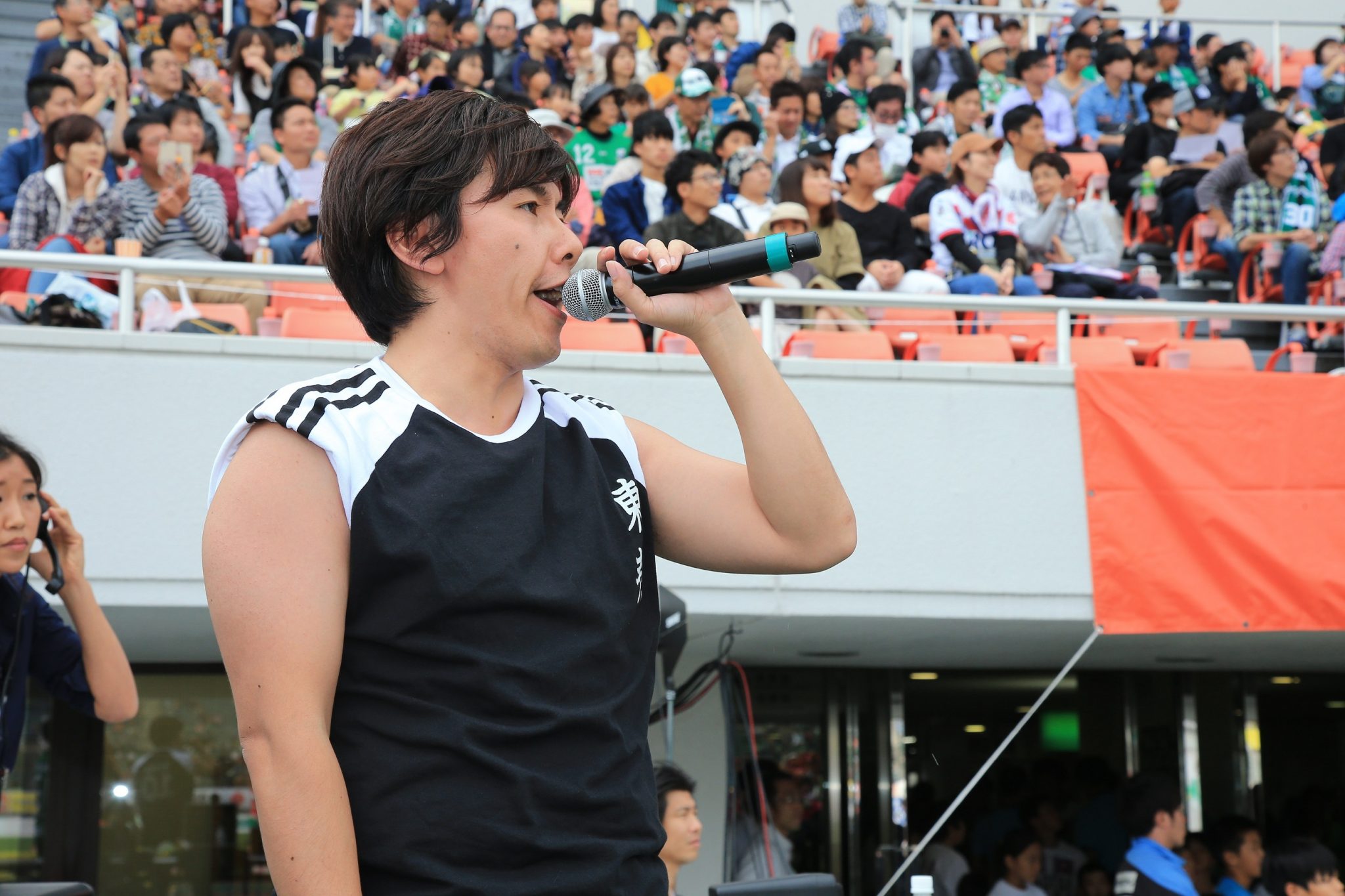 キャプテン翼の人気キャラクター日向小次郎をつとめる声優 佐藤拓也さんと、FC岐阜スタジアムDJの久世良輔さんによるFC岐阜のメンバー紹介をおこないました。