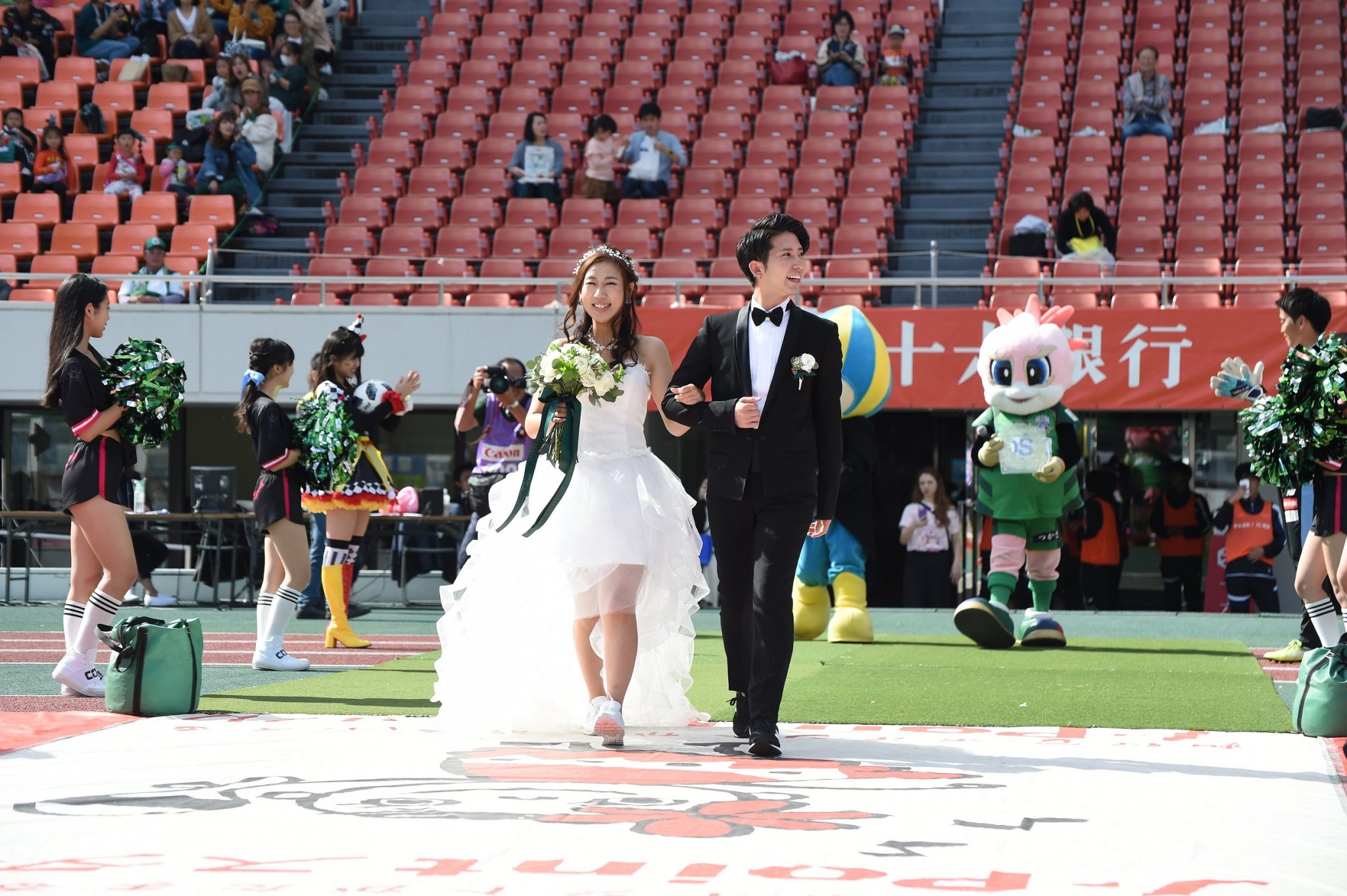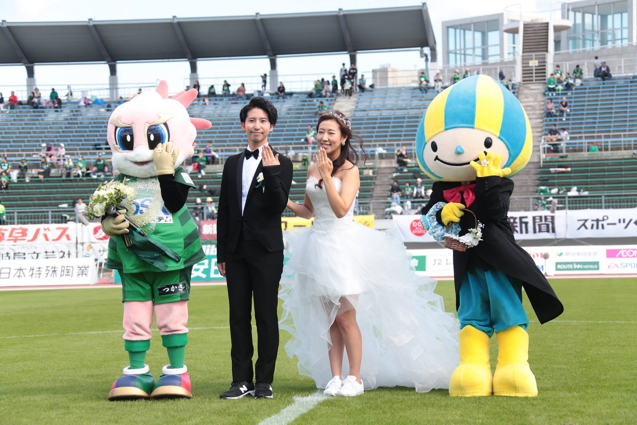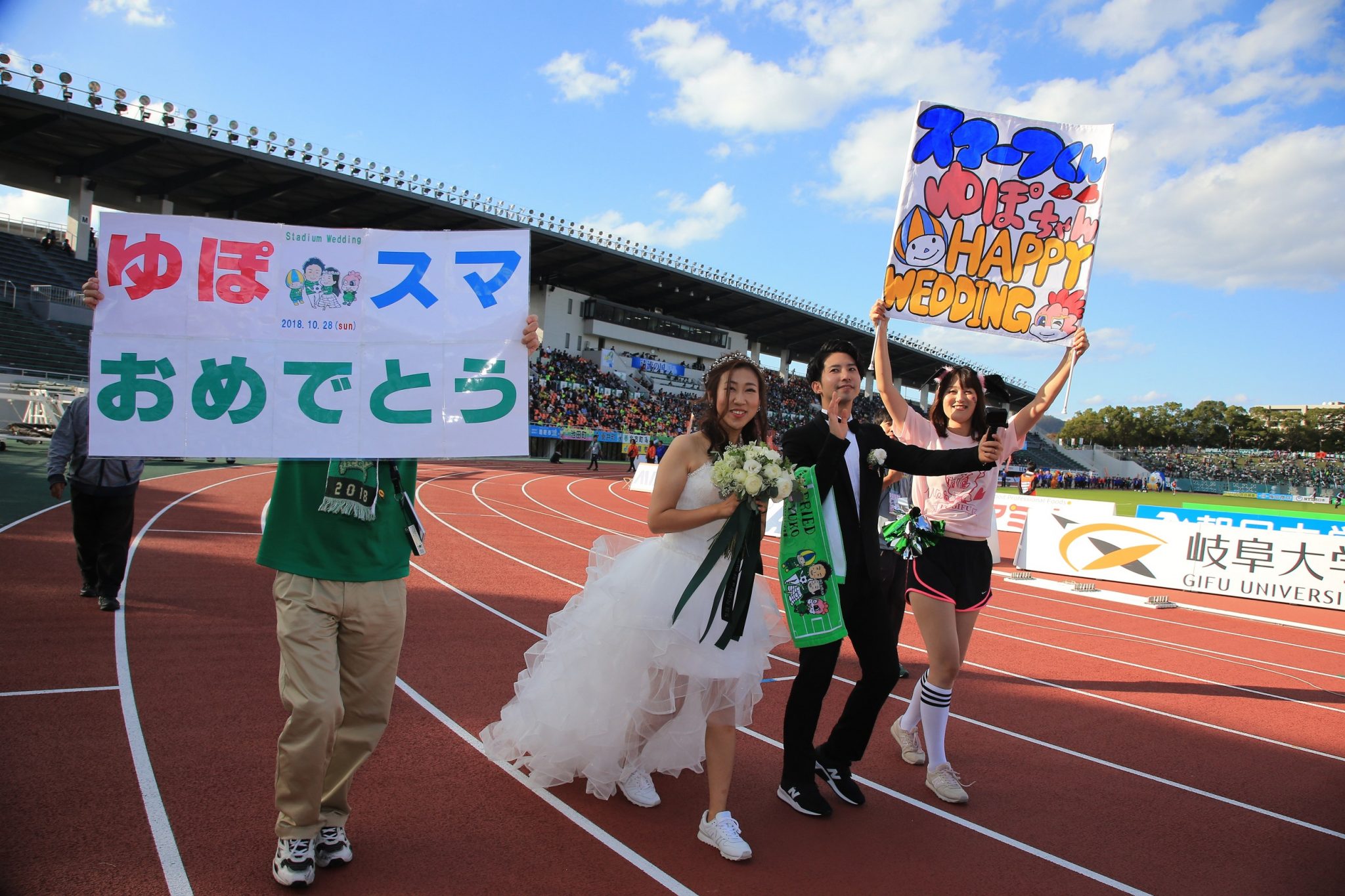 スタジアム観戦で愛をはぐくんだFC岐阜サポーターお二人のスタジアム結婚式が行われました。