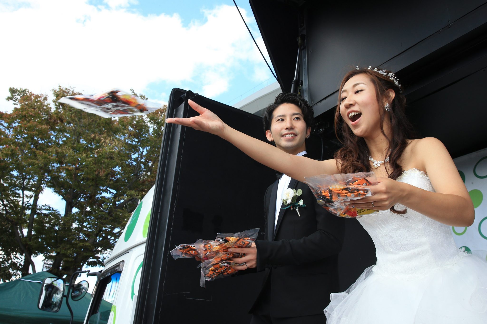 新婦の出立時に家の二階から駄菓子などをまき、幸せのおすそ分けをする東海地方伝統の風習であるお菓子まき。今回はスタジアム結婚式をおこなった二人も加わり、まさに幸せのおすそ分けとなりました♪
