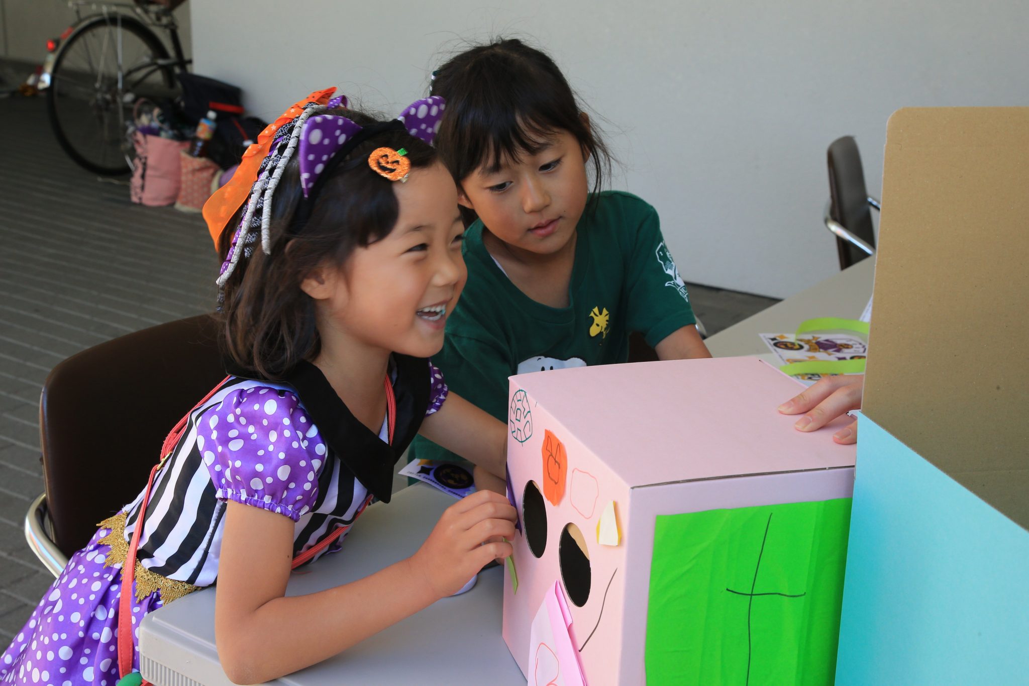 ハロウィン仕様の「親子工作はこパコづくり」を開催。目穴の開いたダンボール箱に紙やペンで飾り付けをして自分だけのオリジナルな『被り物』を製作しました。