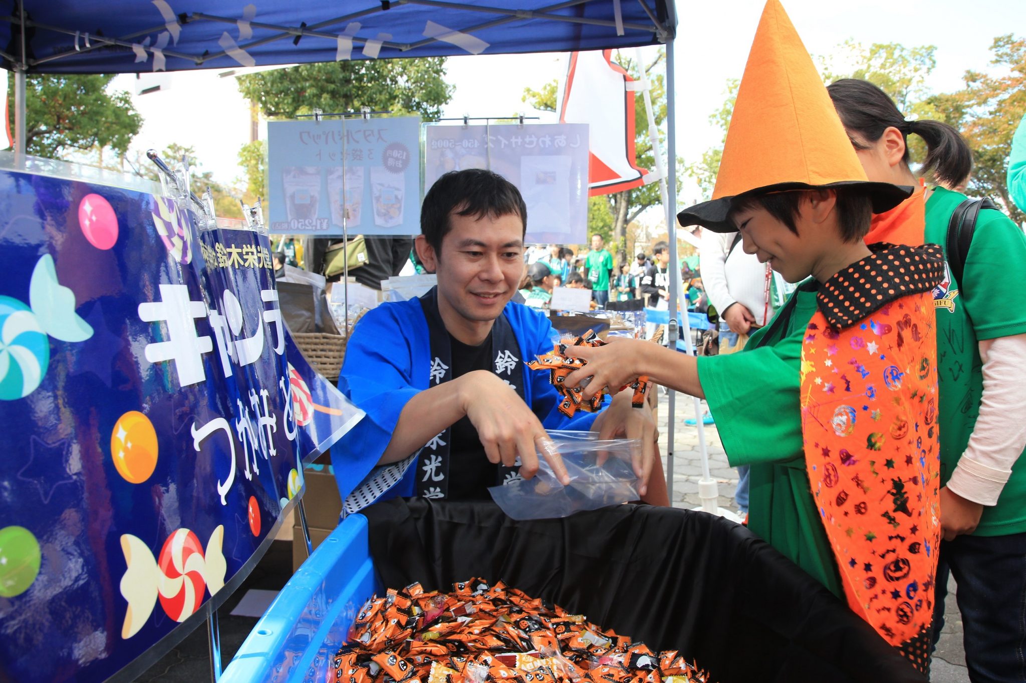 インフォメーションブースでは、「トリックオアトリート」と言ってくれた方に、お菓子とギッフィーリバーシブルお面プレゼントしました!