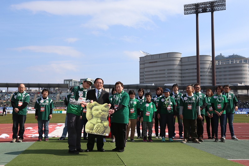 岐阜乗合自動車株式会社 代表取締役社長 黒川 公男 様より、FC岐阜の選手やエンブレム、ギッフィーなどがラッピングされたバスを贈呈していただきました。