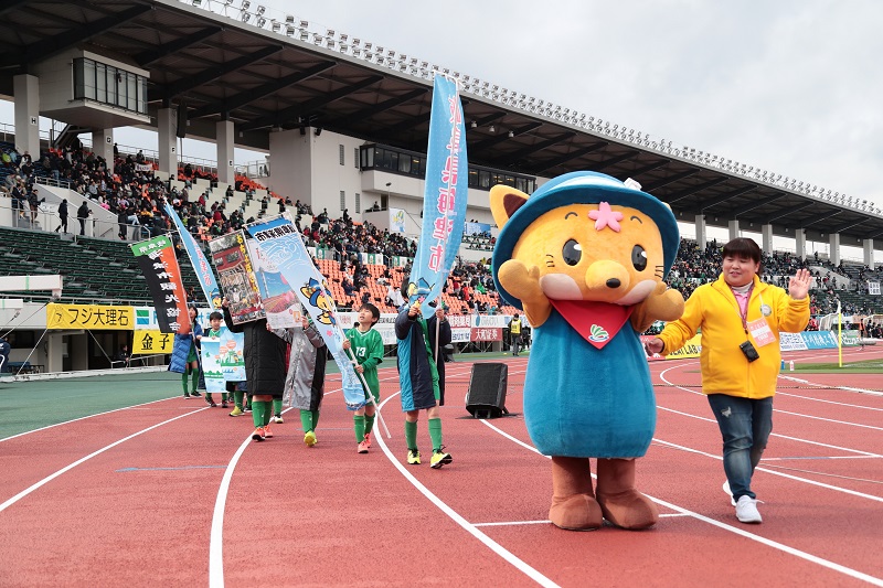 ハーフタイムには、仲良く(対決に勝ったギッフィーがゆないくーをリードに繋ぎ)スタジアムを一周しました。