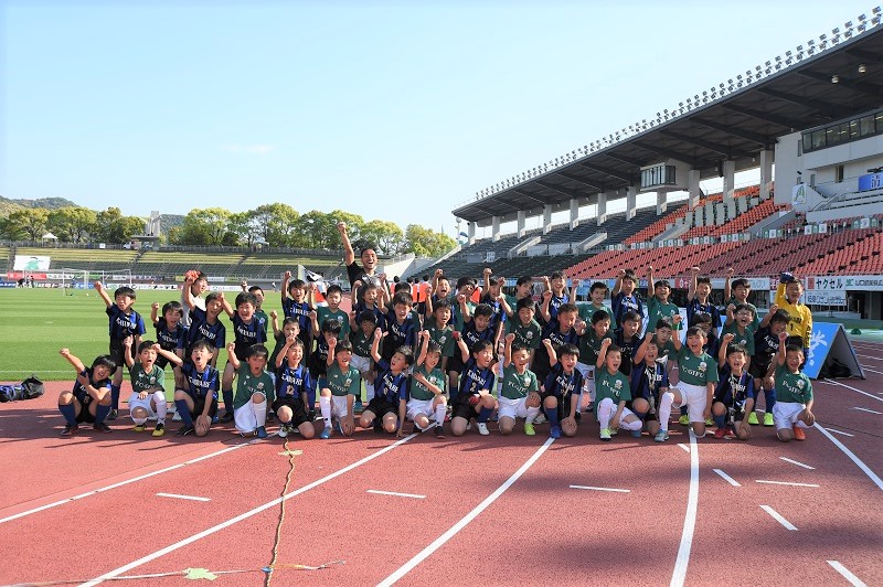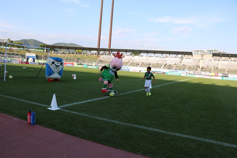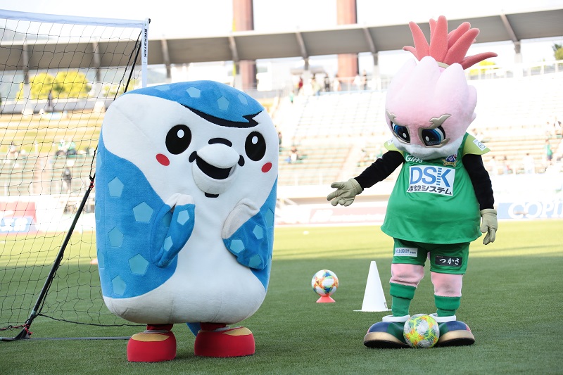 ギッフィーとジンベーニョがチームとなり、こどもチームとサッカー交流をおこないました。