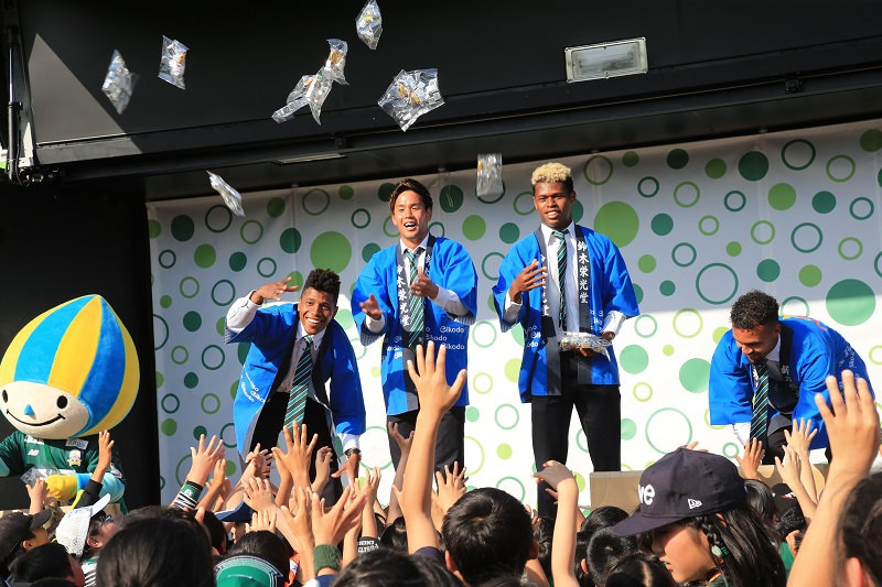 GGG、ギッフィー、ミナモ、FC岐阜からはミシャエル選手、原田祐輔選手、タビナスジェファーソン選手、フレデリック選手が参加してお菓子まきを実施。