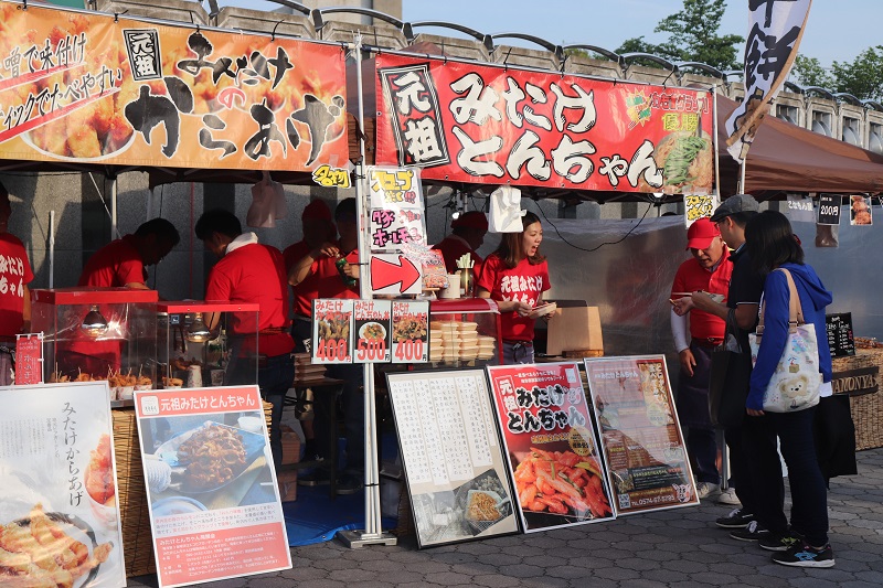 大人気企画ぎふを食べつくせ!として御嵩町から「みたけとんちゃんグルメ・五平餅」が出店。屋台村が味噌ダレのいい匂いに包まれました