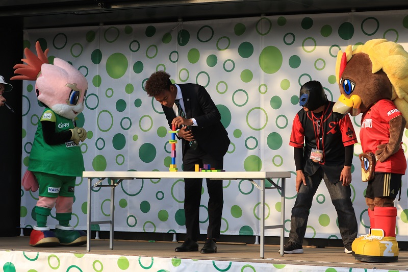 「イヨハ理ヘンリー選手&ギッフィー チーム」vs「ゲンゾー&ツエーゲン金沢サポーター チーム」の積み木対決も行われました!