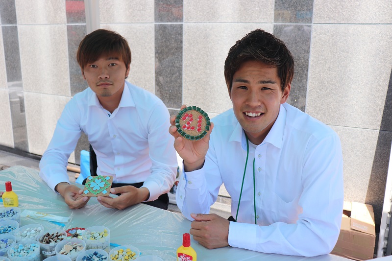 モザイクタイル体験では、原田祐輔選手と市丸瑞希選手も参加して手作りのタイルを作りました。